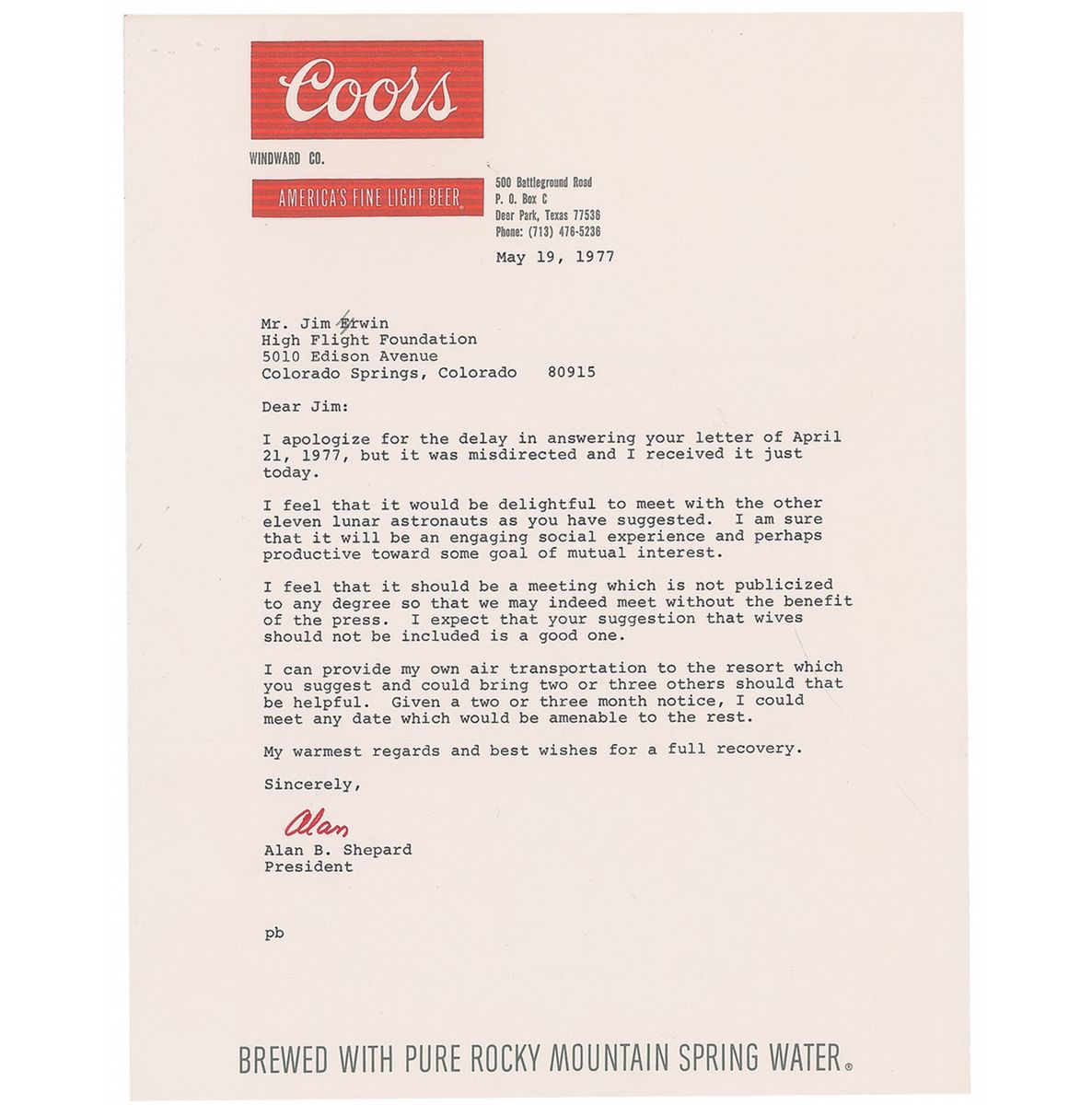 TLS signed “Alan,” one page, 8.5 x 11, Coors letterhead, May 19, 1977. Letter to fellow astronaut Jim Irwin. In full: “I apologize for the delay in answering your letter of April 21, 1977, but it was misdirected and I received it just today. I feel that it would be delightful to meet with the other eleven lunar astronauts as you have suggested. I am sure that it will be an engaging social experience and perhaps productive toward some goal of mutual interest. I feel that it should be a meeting which is not publicized to any degree so that we may indeed meet without the benefit of the press. I expect that your suggestion that wives should not be included is a good one. I can provide my own air transportation to the resort which you suggest and could bring two or three others should that be helpful. Given a two or three month notice, I could meet any date which would be amendable to the rest. My warmest regards and best wishes for a full recovery.” In fine condition, with a couple staple holes to top left. Shepard may be making reference to a reunion of Apollo astronauts at the Johnson Space Center on August 22, 1978, attended by Shepard, Armstrong, Aldrin, Collins, Cernan, and others. Correspondence between astronauts is not readily available.