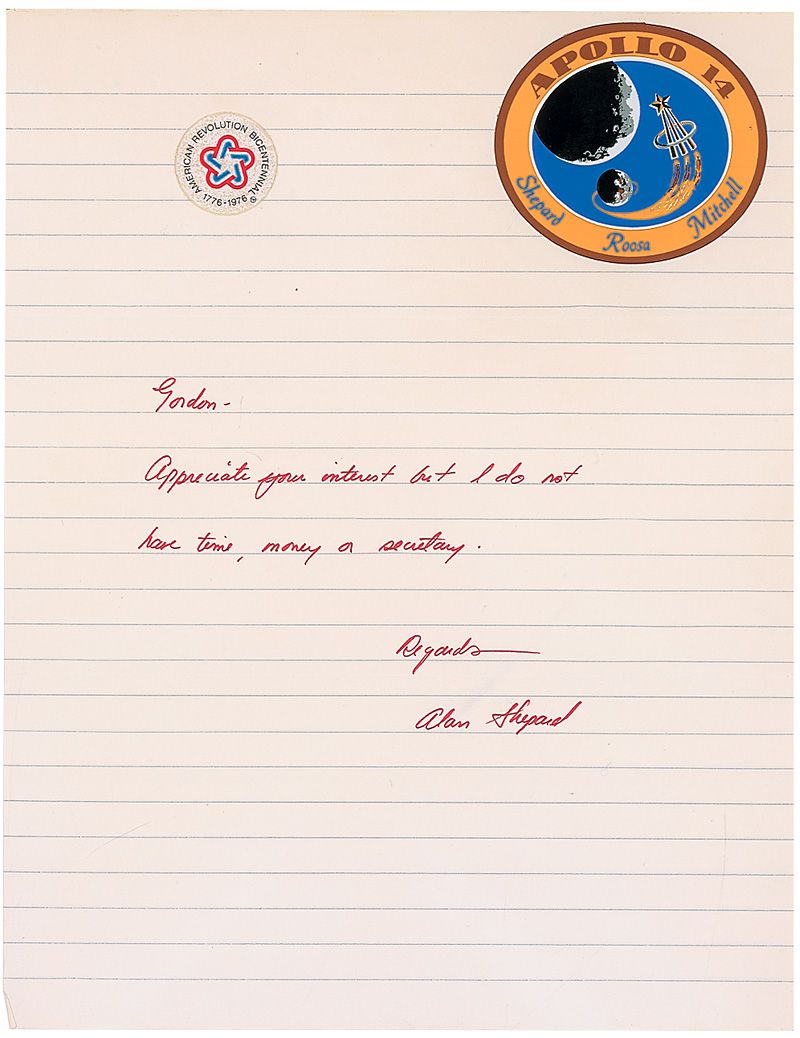 ALS, one page, lightly-lined, 7.75 x 10, no date. Brief letter to an admirer. In full: “Appreciate your interest but I do not have time, money or secretary.” An Apollo 14 emblem sticker and a bicentennial sticker are affixed to upper portion of the page. In fine condition.