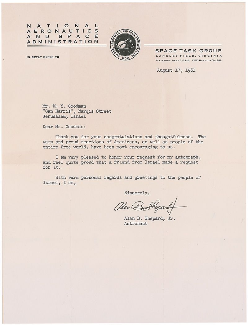 TLS signed “Alan B. Shepard, Jr.,” one page, 8 x 10.25, NASA Space Task Group letterhead, August 17, 1961. Letter of thanks to a supporter. In part: “Thank you for your congratulations and thoughtfulness. The warm and proud reactions of Americans, as well as people of the entire free world, have been most encouraging to us. I am very pleased to honor your request for my autograph, and feel quite proud that a friend from Israel made a request for it.” In fine condition, with intersecting folds, one through a single letter of signature.