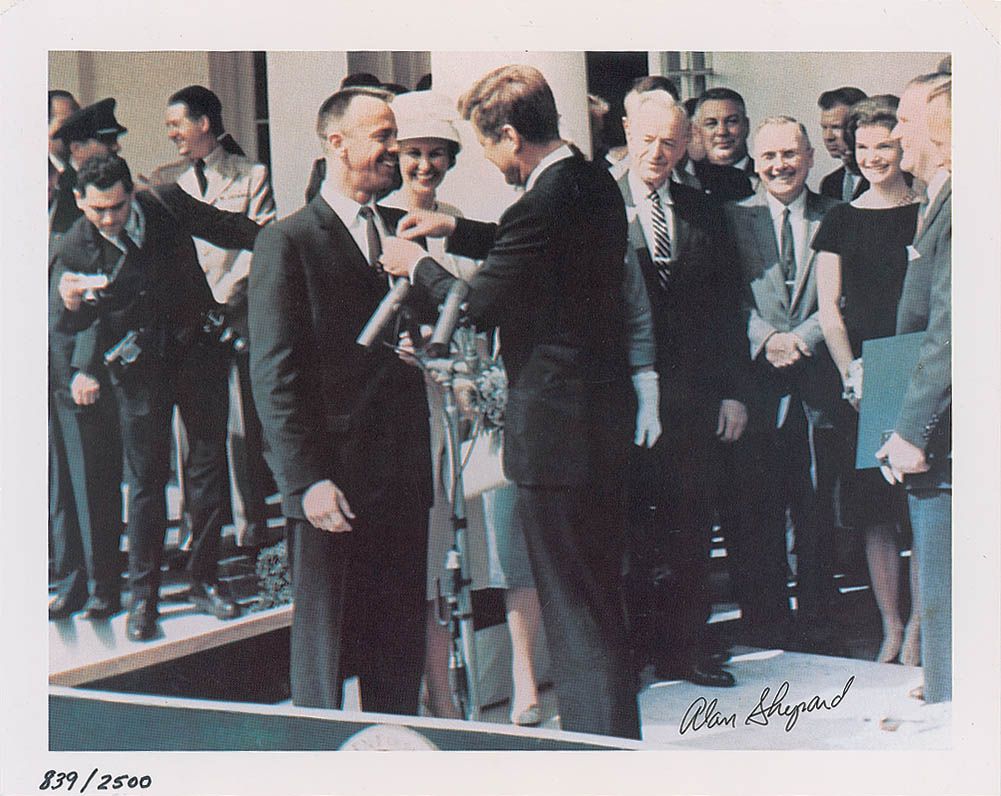 Distinguished limited edition color glossy 9.25 x 7.25 photo of Shepard receiving a medal from President John F. Kennedy, #839/2500, signed in black felt tip by Shepard. In fine condition.