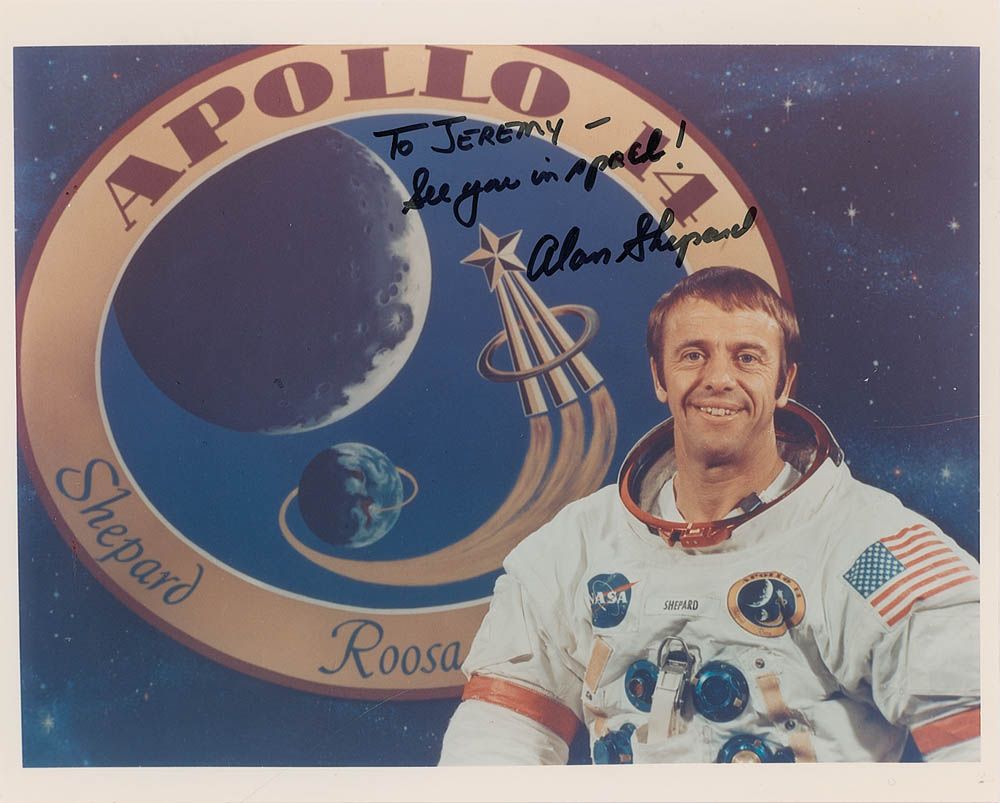 Color satin-finish 10 x 8 photo of Shepard posing in his space suit in front of the Apollo 14 mission insignia, signed and inscribed in black felt tip “To Jeremy—See you in space! Alan Shepard.” In fine condition, with a couple surface marks and dings to right side.