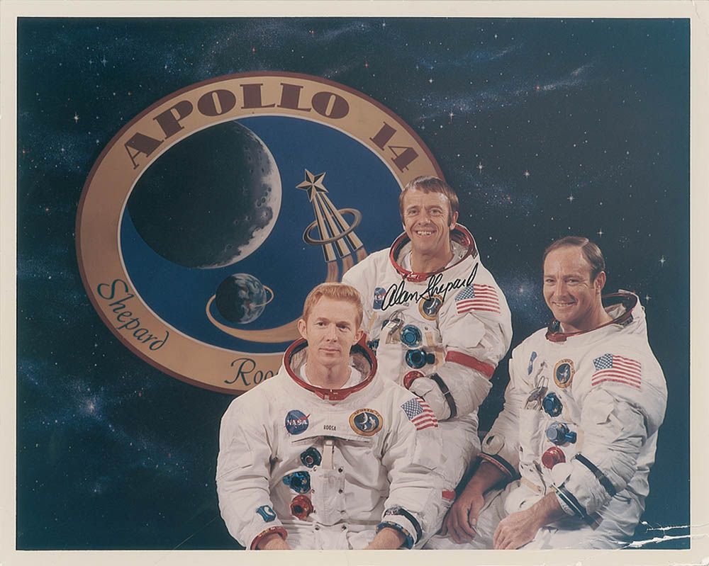 Color glossy 10 x 8 NASA photo of the Apollo 14 crew posing in front of their mission emblem, signed in black felt tip. In very good condition, with a couple small tears and creases to lower right corner which could be matted out, and a few other corner tip creases.