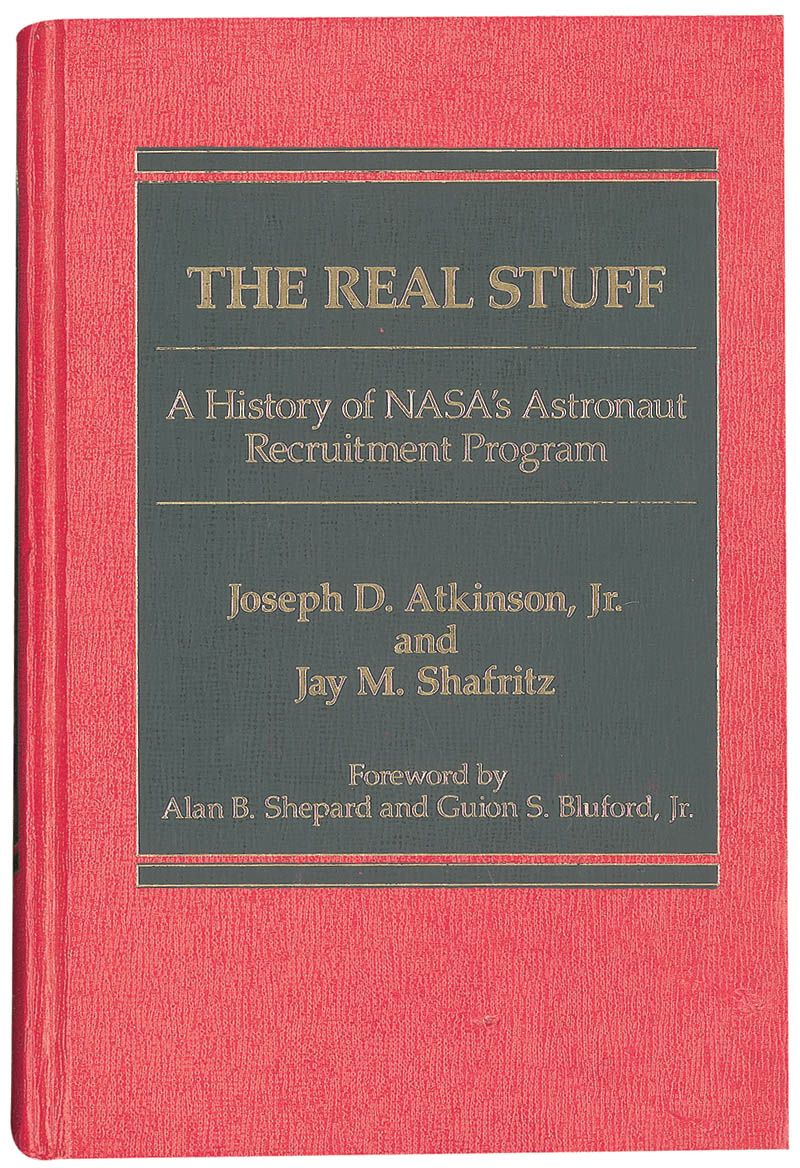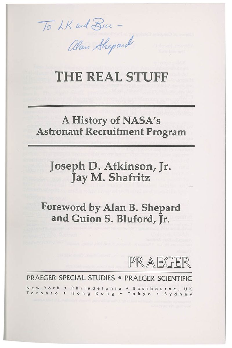 Signed book: The Real Stuff. NY: Praeger, 1985. Hardcover, 6.5 x 9.5, 227 pages. Signed and inscribed on the title page in blue ballpoint “To LK and Bill—Alan Shepard.” A few dings and impressions to the lower right of the front cover, otherwise fine condition.