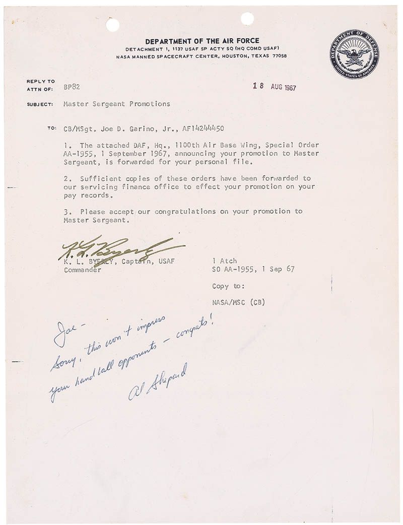 ANS signed “Al Shepard,” one page, 8 x 10.5, Department of the Air Force letterhead, no date. Note written by Shepard at the bottom of a memo to Master Sergeant Joe Garino, stamp-dated August 18, 1967. Memo reads, in part “The attached DAF, Hq., 1100th Air Base Wing, Special Order AA-1955, 1 September 1967, announcing your promotion to Master Sergeant, is forwarded for your personal file.” At the bottom, Shepard writes, “Joe—Sorry, this won’t impress your hand ball opponents—congrats!” In fine condition, with two punch and staple holes to top edge and a bit of trivial soiling. Accompanied by a photocopy of a letter of provenance from Garino.