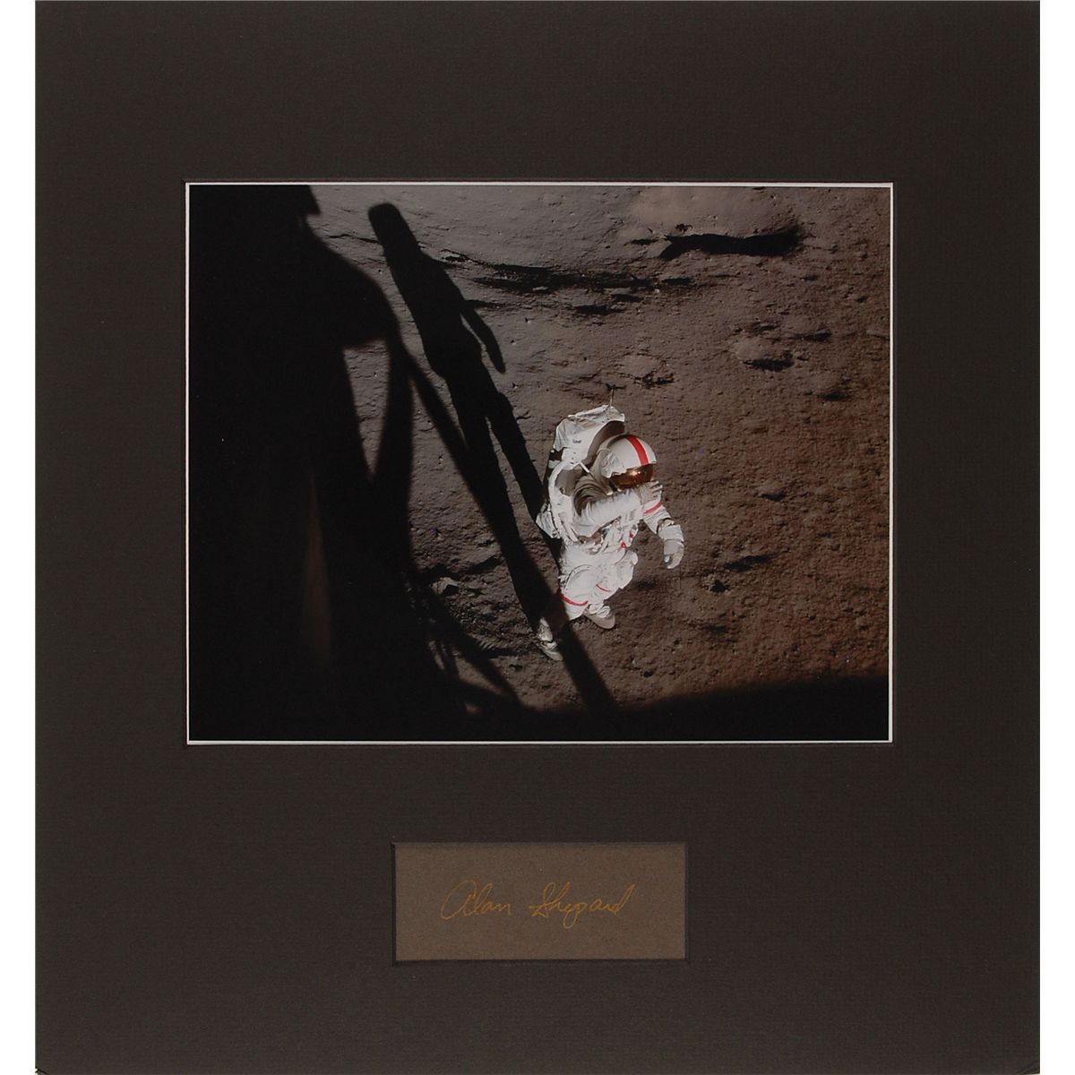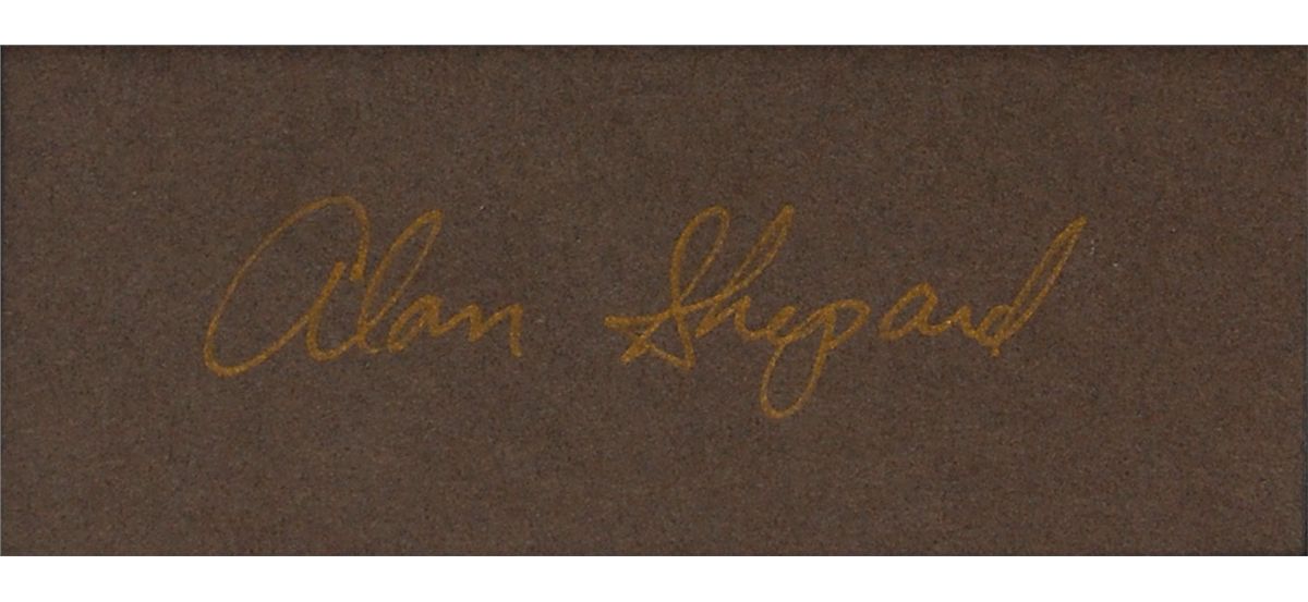 Gold ink signature, “Alan Shepard,” on a black 4 x 1.5 card. Matted with a photo of Shepard saluting on the moon to an overall size of 14 x 15. In fine condition.