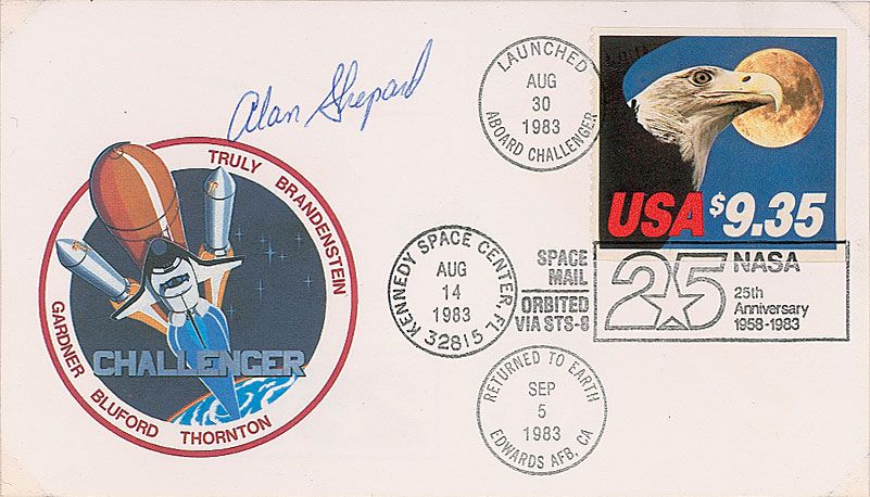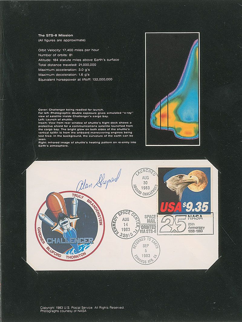 Flown cover with a cachet honoring the STS-8 Challenger mission, flown in orbit during STS-8 from August 30 to September 5, 1983, signed in blue ballpoint by Alan Shepard. Displayed in its original 8.5 x 11 NASA/USPS presentation folder. In fine condition.