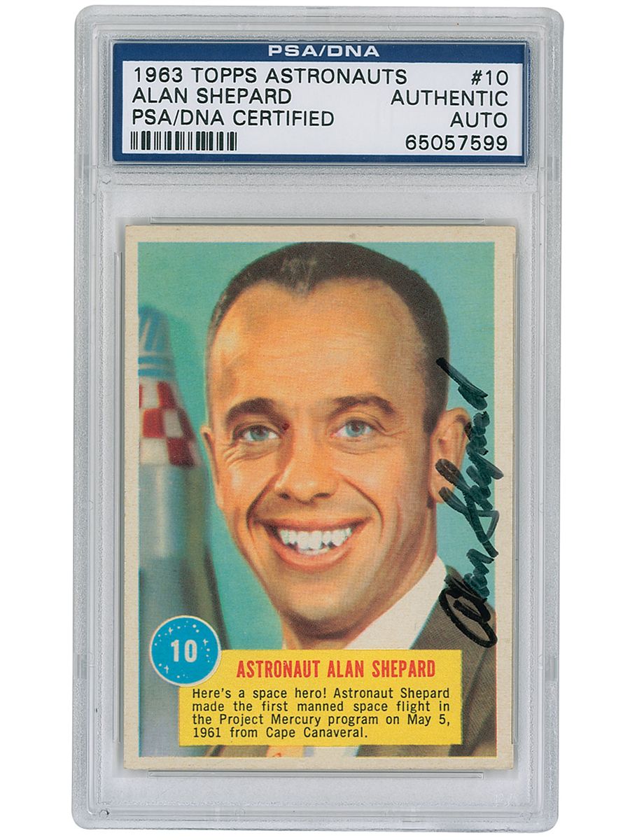 Color 1963 Topps Astronauts 3-D trading card, #10, signed vertically on the portrait side in black felt tip, “Alan Shepard.” Encapsulated in a plastic PSA/DNA authentication holder. In fine condition.