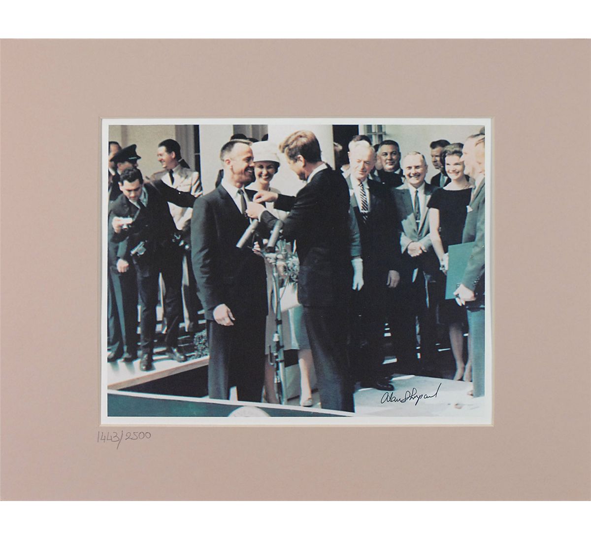 Distinguished limited edition color glossy 9.25 x 7.25 photo of Shepard receiving a medal from President John F. Kennedy, #1443/2500, signed in black felt tip by Shepard. Double-matted to an overall size of 14 x 11; and a hand-painted ceramic figurine of Shepard holding the American flag on the lunar suface, by the US Historical Society. Figurine stands 9.5? tall. In fine condition.