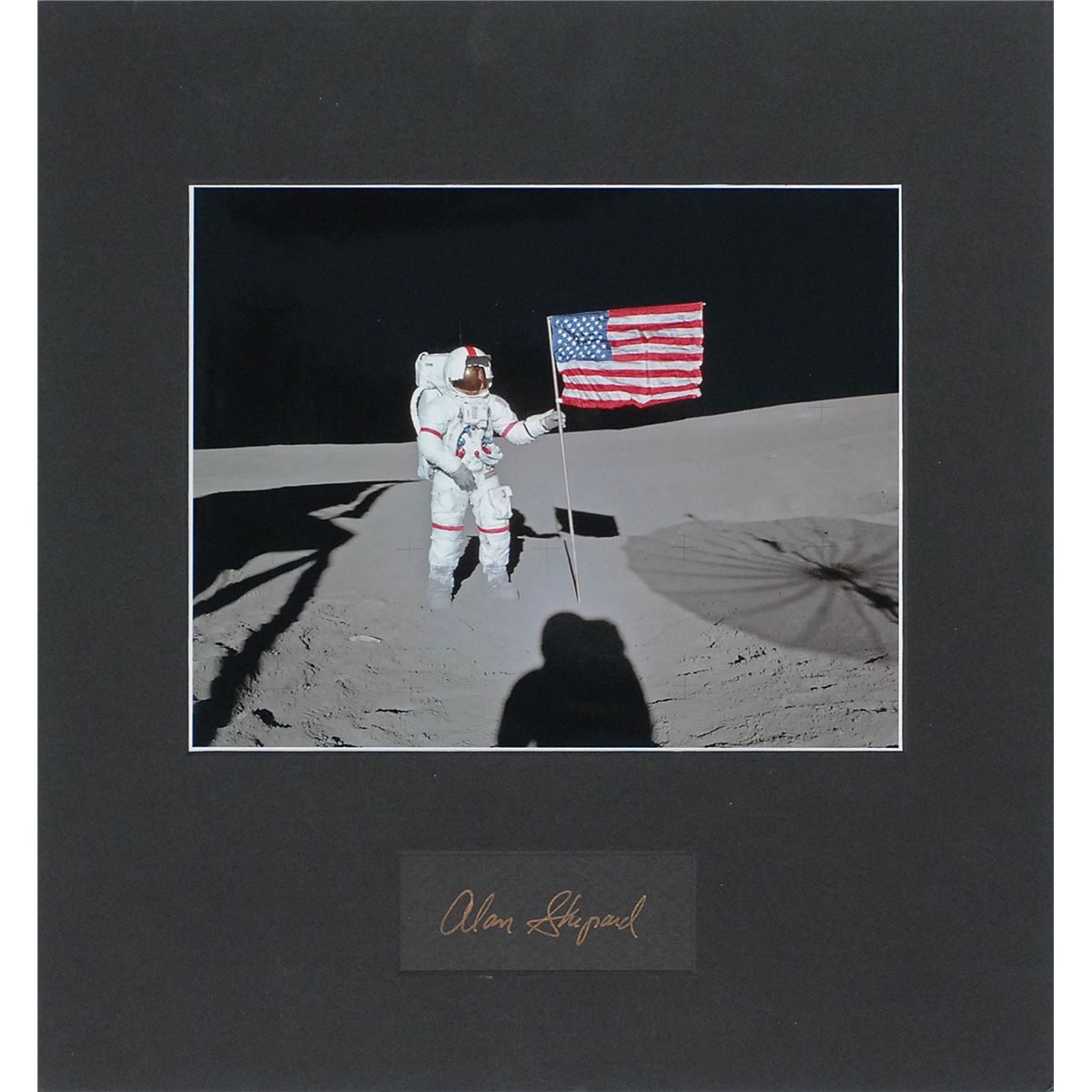 Sharp gold ink signature, “Alan Shepard,” on a black card. Matted with a color photo of Shepard posing by the American flag on the lunar surface to an overall size of 14 x 15. In very fine condition.