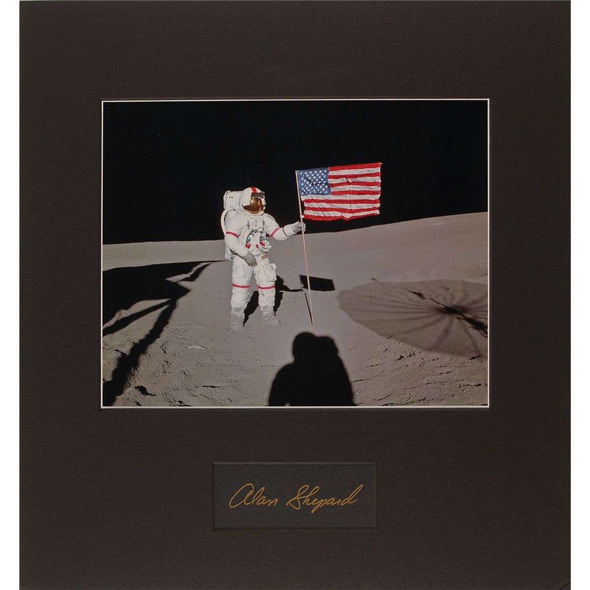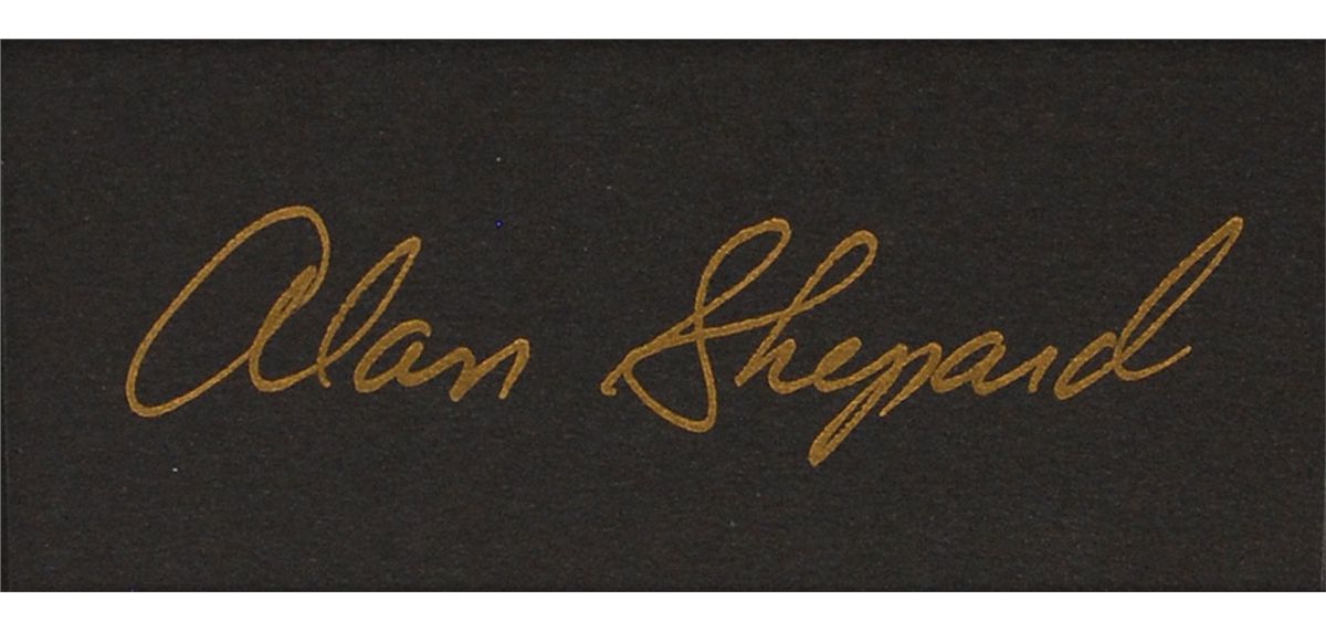 Gold ink signature, “Alan Shepard,” on a black 4 x 1.5 card. Matted with a photo of Shepard next to an American flag on the moon to an overall size of 14 x 15. In fine condition.
