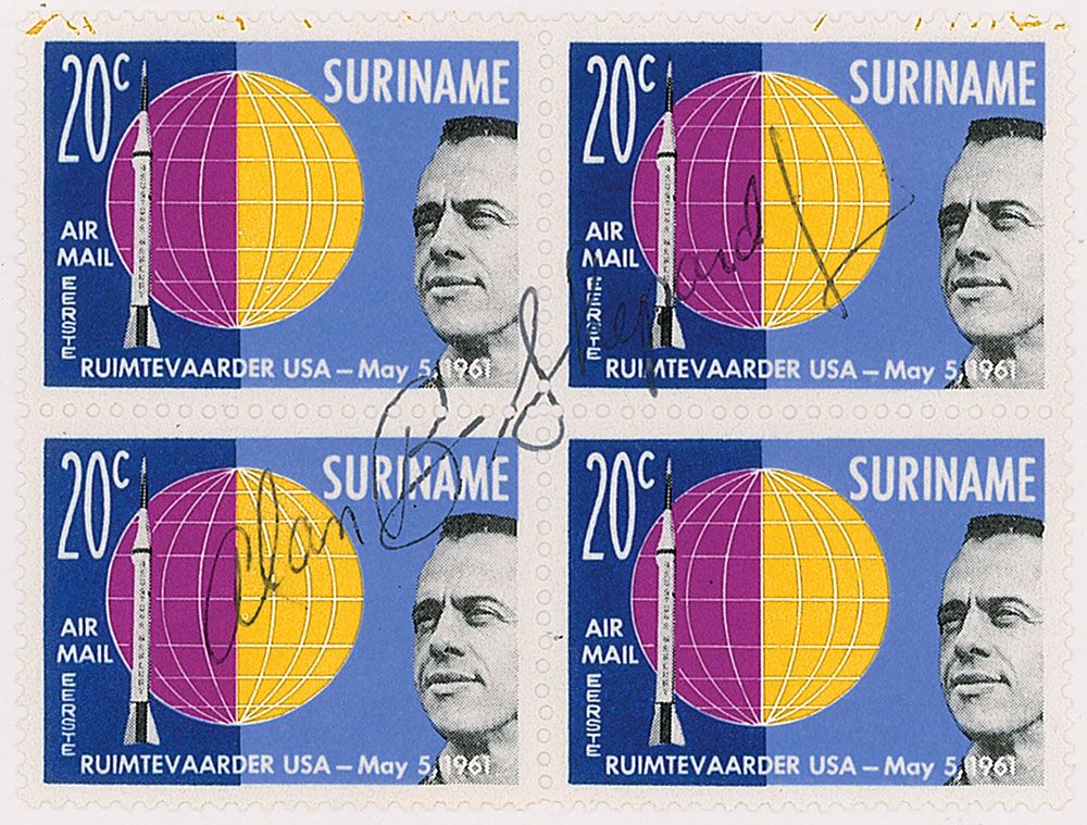 Block of four 20-cent Suriname postage stamps honoring Shepard, 3 x 2.25, signed across the block in black ink, “Alan B. Shepard, Jr.” In fine condition, with some light contrast to last name of signature.