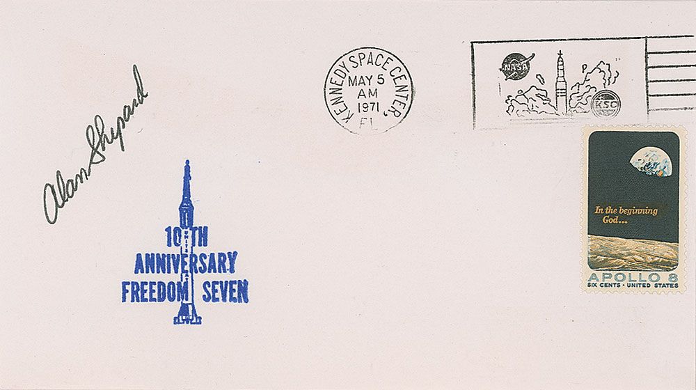 Commemorative cover with a stamped cachet honoring the 10th anniversary of the flight of Freedom Seven, signed in black felt tip. In very fine condition.