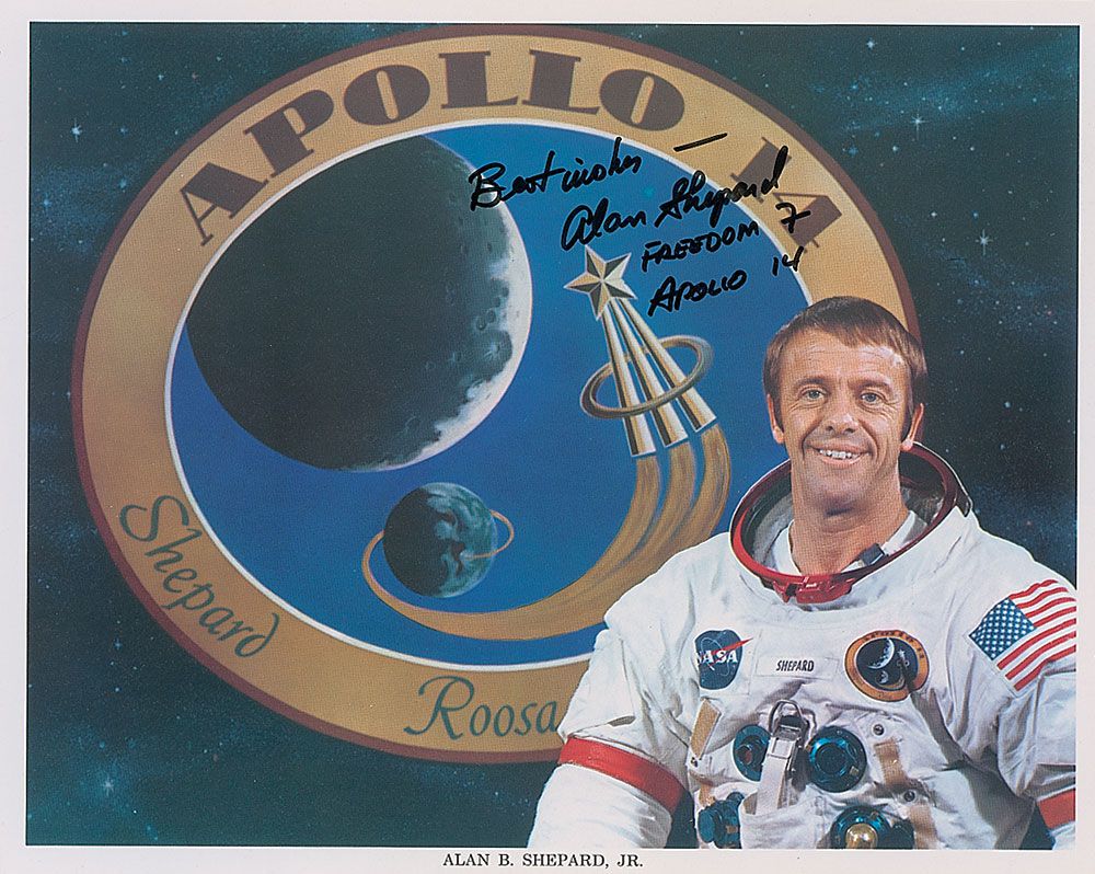 Color 10 x 8 NASA photo of Shepard posing in his spacesuit in front of the Apollo 14 mission insignia, signed in black felt tip, “best wishes—Alan Shepard, Freedom 2, Apollo 14.” In very fine condition.