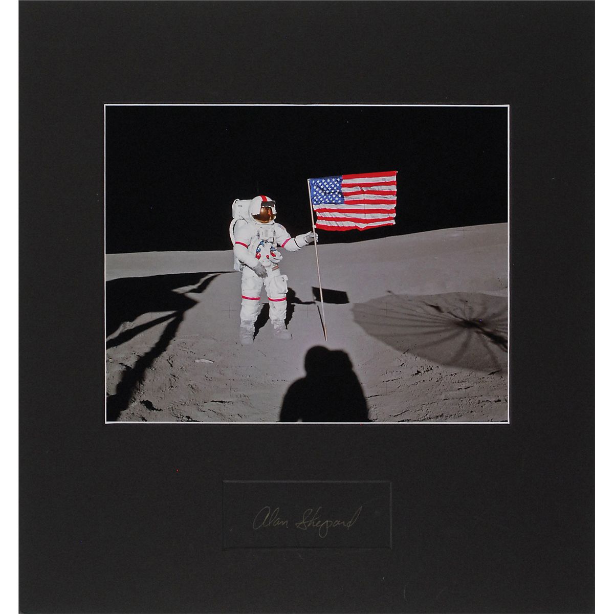 Crisp gold ink signature, “Alan Shepard,” on a black card. Matted with a fantastic color photo of Shepard saluting from the lunar surface to an overall size of 14 x 15. In very fine condition.