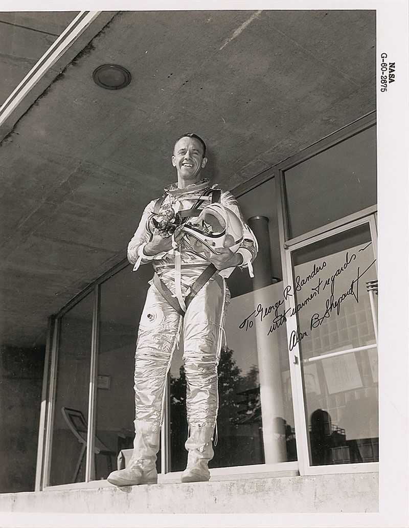 Uncommon vintage glossy 7.75 x 10 NASA photo of Shepard posing outside in his Mercury space suit, signed and inscribed in black ink, “To George R. Sanders, with warmest wishes—Alan B. Shepard, Jr.” In fine condition, with a slightly trimmed vertical left edge.