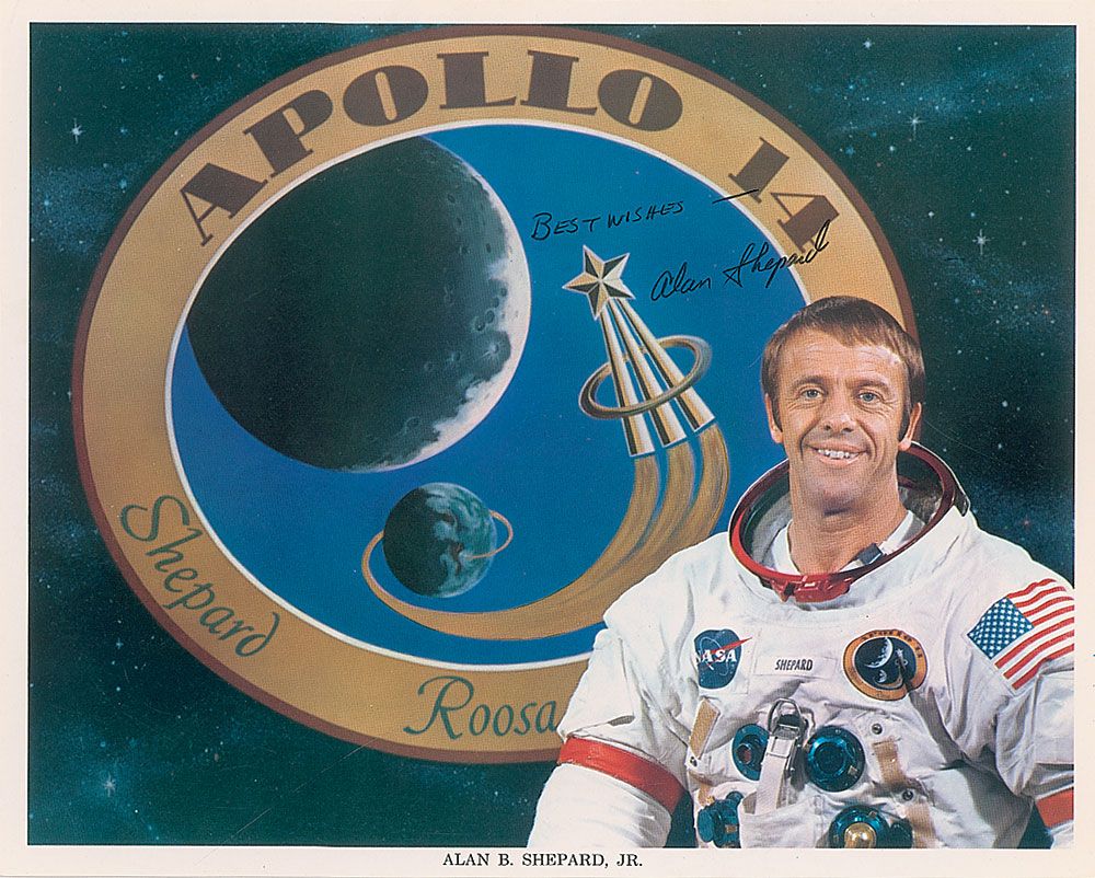 Color 10 x 8 NASA litho of Shepard posing in his space suit in front of the Apollo 14 mission insignia, signed in black ink. In fine condition.