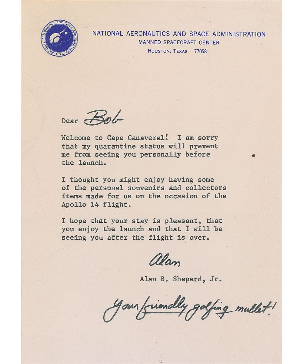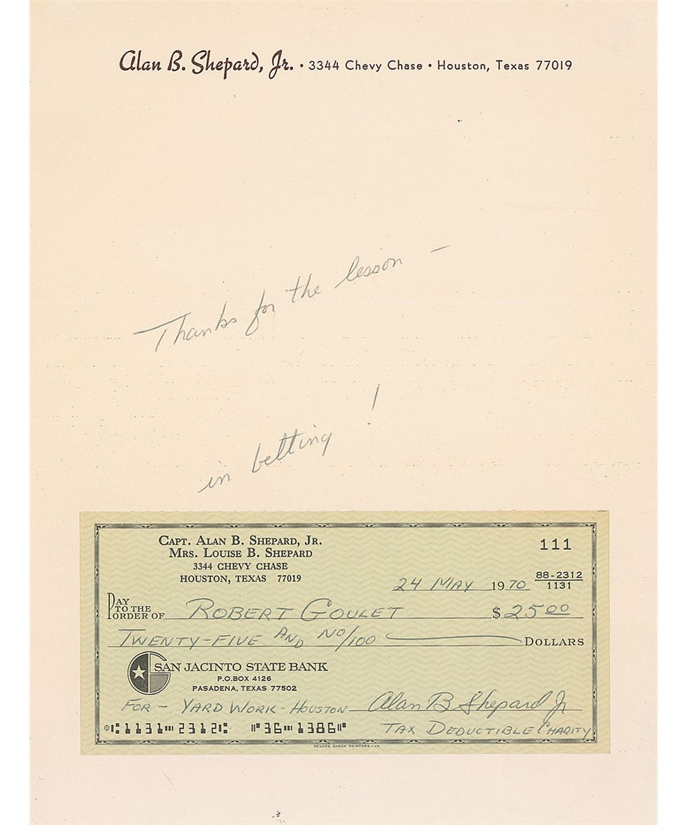 TLS, signed “Alan, your friendly golfing mullet!,” one page, NASA letterhead, 5.25 x 7.25, no date. Letter written to Robert Goulet, shortly before his Apollo 14 mission. In part: “I am sorry that my quarantine status will prevent me from seeing you personally before the launch. I thought you might enjoy having some of the personal souvenirs and collectors items made for us on the occasion of the Apollo 14 flight.” Letter is affixed by its top edge to an identical size sheet. Also included is a personal check, 6 x 2.75, filled out and signed by Shepard, “Alan B. Shepard, Jr.,” payable to Robert Goulet for $25.00, May 24, 1970, with Shepard writing, “Tax Deductible Charity,” under his signature. Check is affixed to a 7 x 9.5 sheet of Shepard’s personal stationery, which reads, “Thanks for the lesson—in betting!” In fine condition. A humorous personal association and neat reference to one of Shepard’s claims to fame, as the first person to hit a golf ball on the moon during the Apollo 14 mission. Items originate from the estate of Robert Goulet.