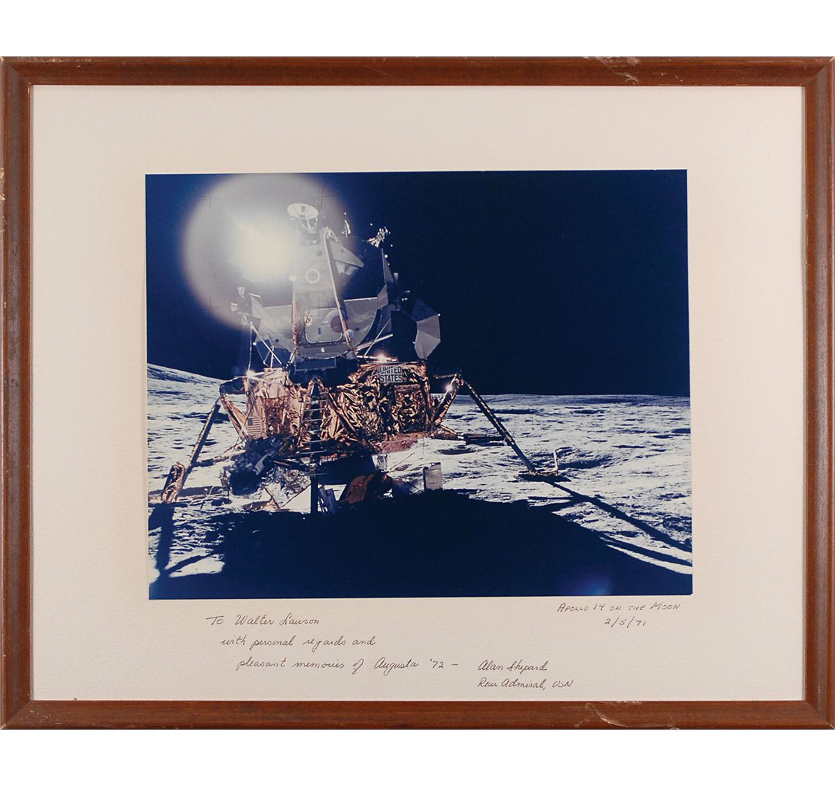 Color vintage semi-glossy 13.5 x 10.75 photo of the Antares on the lunar surface, affixed to its original 19.5 x 15.5 mount, signed and inscribed on the mount in black ink, “To Walter Lawson, with personal regards and pleasant memories of Augusta ’72—Alan Shepard, Rear Admiral, USN,” with Shepard adding, “Apollo 14 on the moon, 2/5/71,” directly under the image. Framed (with no glass) to an overall size of 21 x 17. In fine condition. A captivating image with a subtle golf relation to the only astronaut to hit a golf ball on the moon.