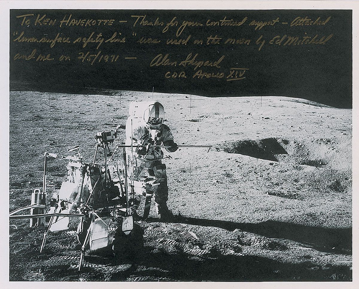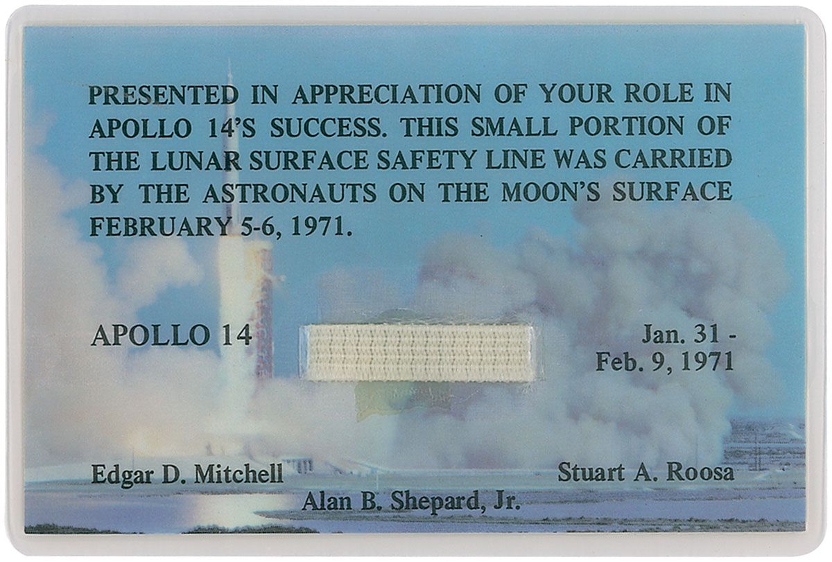Flown one-inch long section of lunar surface safety line, carried on the surface of the moon during the Apollo 14 mission, presented to NASA employee Stephen T. Dunham. Swatch is laminated to a 3.25 x 2.75 presentation card reading “Presented in appreciation of your role in Apollo 14’s success. This small portion of the lunar surface safety line was carried by the astronauts on the moon’s surface February 5–6, 1971”; and an official 10 x 8 NASA lithograph of Alan Shepard conducting an experiment on the lunar surface, signed and inscribed in gold ink, “To Ken Havekotte—Thanks for your continued support—attached ‘lunar surface safety line’ was used on the moon by Ed Mitchell and me on 2/5/1971—Alan Shepard, CDR Apollo XIV.” In fine condition. Pictured in the photo is the lunar device that housed the 100-foot safety line in case it would be needed. Shown at Shepard’s right is the Modular Equipment Transporter (MET), which contained the stored location of the lunar surface safety line, designed to be used in an emergency to allow one astronaut to pull another to safety. The MET was a pull-type two-wheeled cart for carrying equipment and lunar samples. It was referred to as the ‘lunar rickshaw.’ Despite the overall 100-foot size of the line, very few examples appear on the market.
