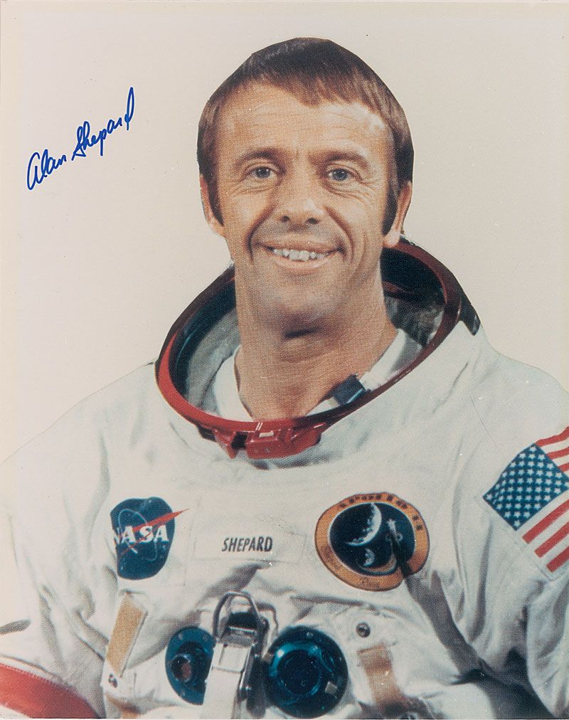 Color glossy 8 x 10 photo of Shepard in his white Apollo space suit, signed in blue felt tip. In very fine condition.