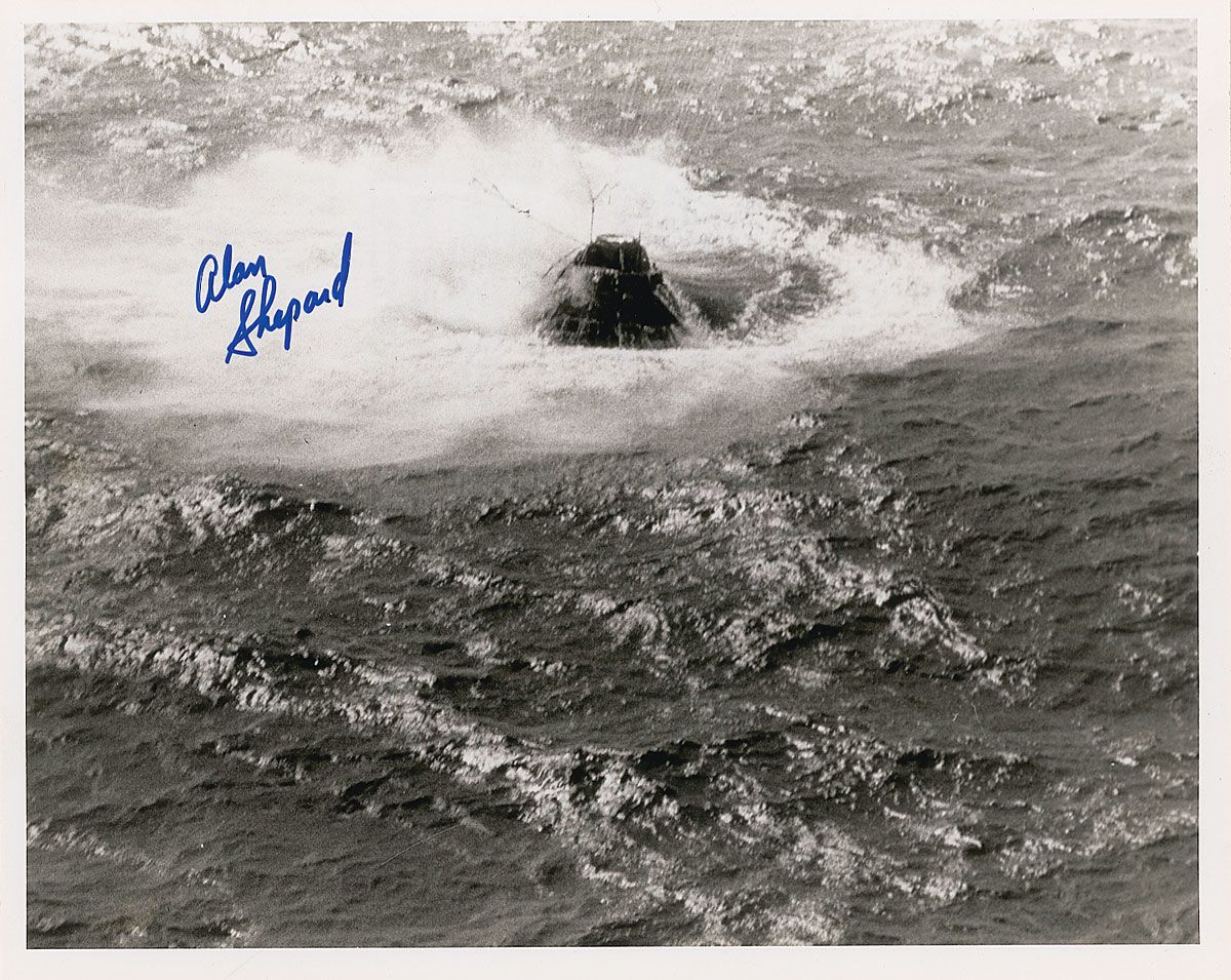 Glossy 10 x 8 NASA photo of the Apollo 14 splashdown, signed in blue felt tip. In fine condition.