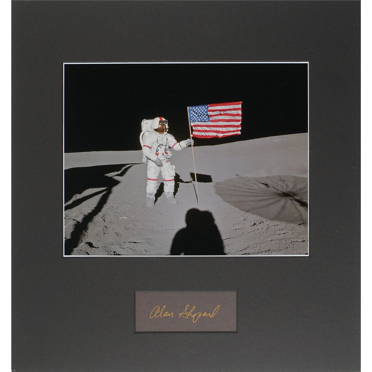 Crisp gold ink signature, “Alan Shepard,” on a black 4 x 1.75 card. Matted with a fantastic color photo of Shepard on the lunar surface to an overall size of 14 x 15. In very fine condition.