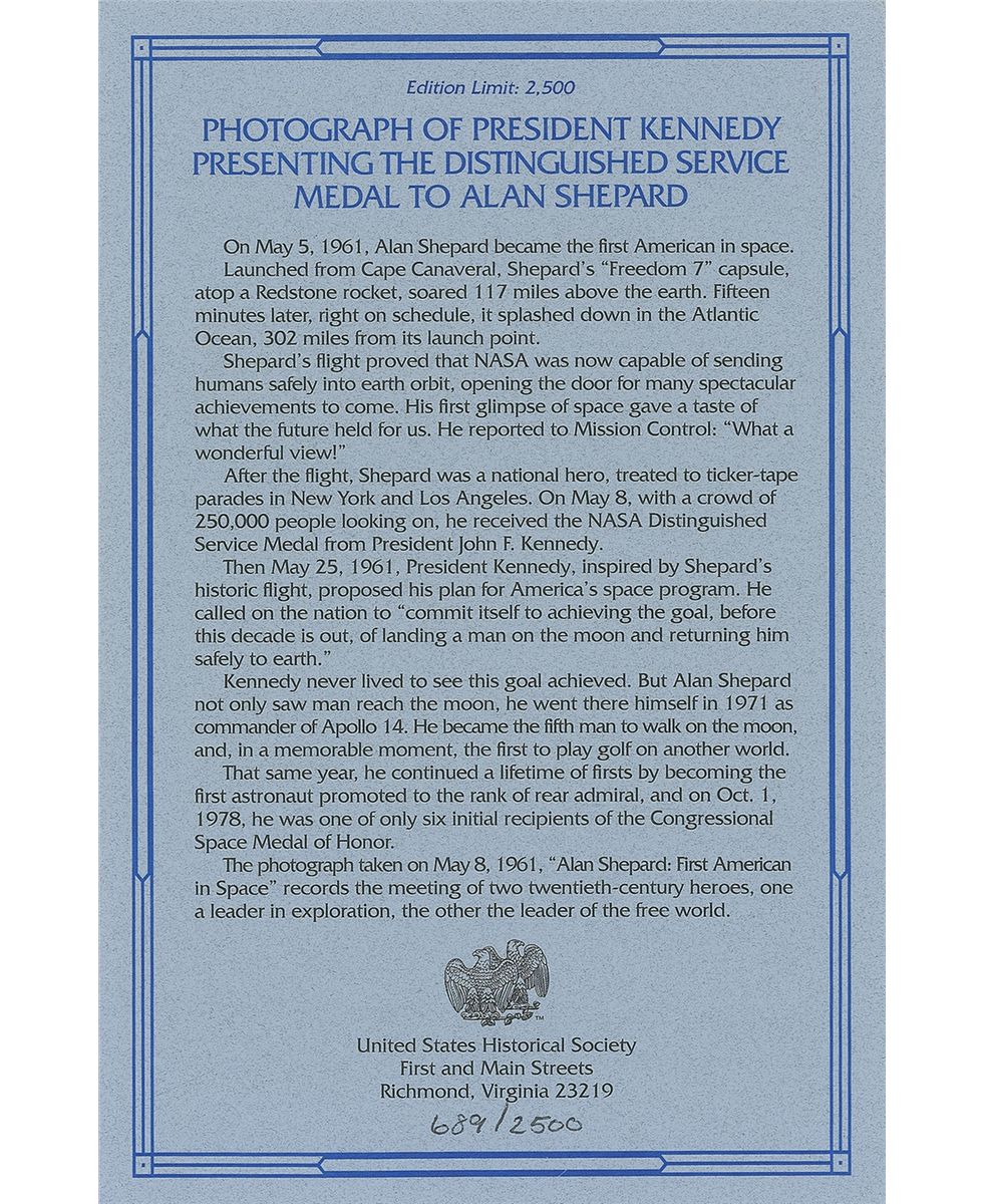 Limited edition color 10 x 8 cardstock photo of President Kennedy presenting the Distinguished Service Medal to Shepard, signed in black felt tip. In fine condition, with surface loss to upper corners, seemingly from neatly removed mounting tape. Accompanied by an informational sheet from the United States Historical Society describing the event and numbering this photo 689/2500.