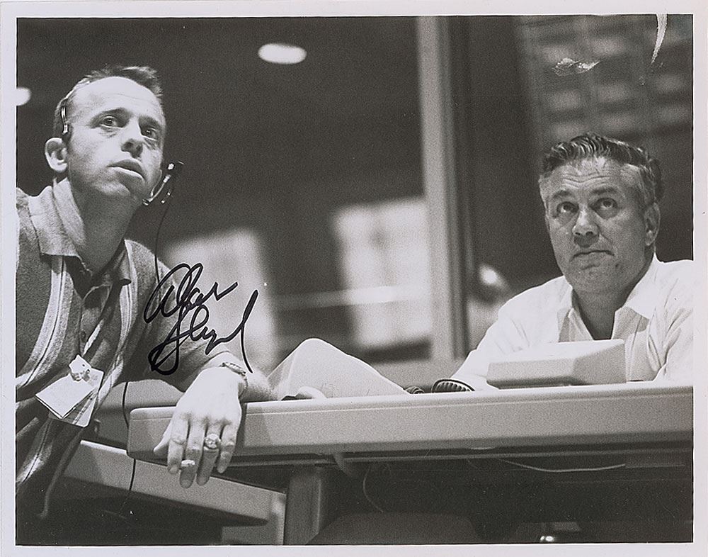 Official glossy 10 x 8 NASA photo of Shepard and Walter Williams monitoring Gordon Cooper’s Mercury flight, signed in black felt tip by Shepard. In fine condition.