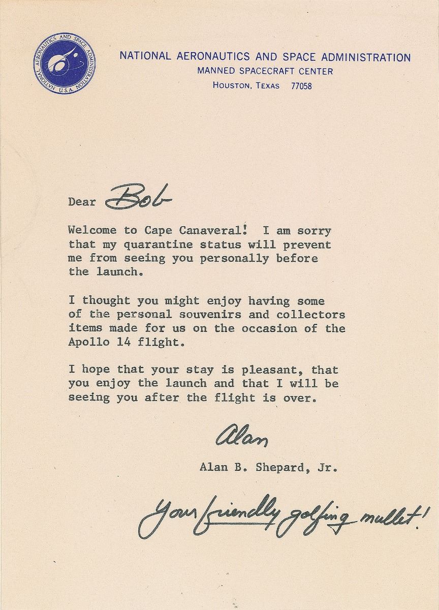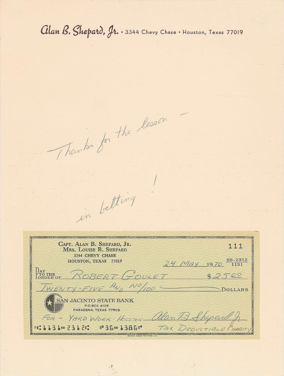 TLS, signed “Alan, your friendly golfing mullet!,” one page, NASA letterhead, 5.25 x 7.25, no date. Letter written to Robert Goulet, shortly before his Apollo 14 mission, in part: “I am sorry that my quarantine status will prevent me from seeing you personally before the launch. I thought you might enjoy having some of the personal souvenirs and collectors items made for us on the occasion of the Apollo 14 flight.” Shepard has added the recipient’s name. Also included is a personal check, 6 x 2.75, filled out and signed by Shepard, “Alan B. Shepard, Jr.,” payable to Robert Goulet for $25, May 24, 1970, with Shepard writing, “Tax Deductible Charity,” below his signature. Check is affixed to a 7.25 x 9.5 sheet of Shepard’s personal stationery, with Shepard adding, “Thanks for the lesson—in betting!” In fine condition. A neat reference to one of Shepard’s claims to fame as the first person to hit a golf ball on the moon during the Apollo 14 mission.