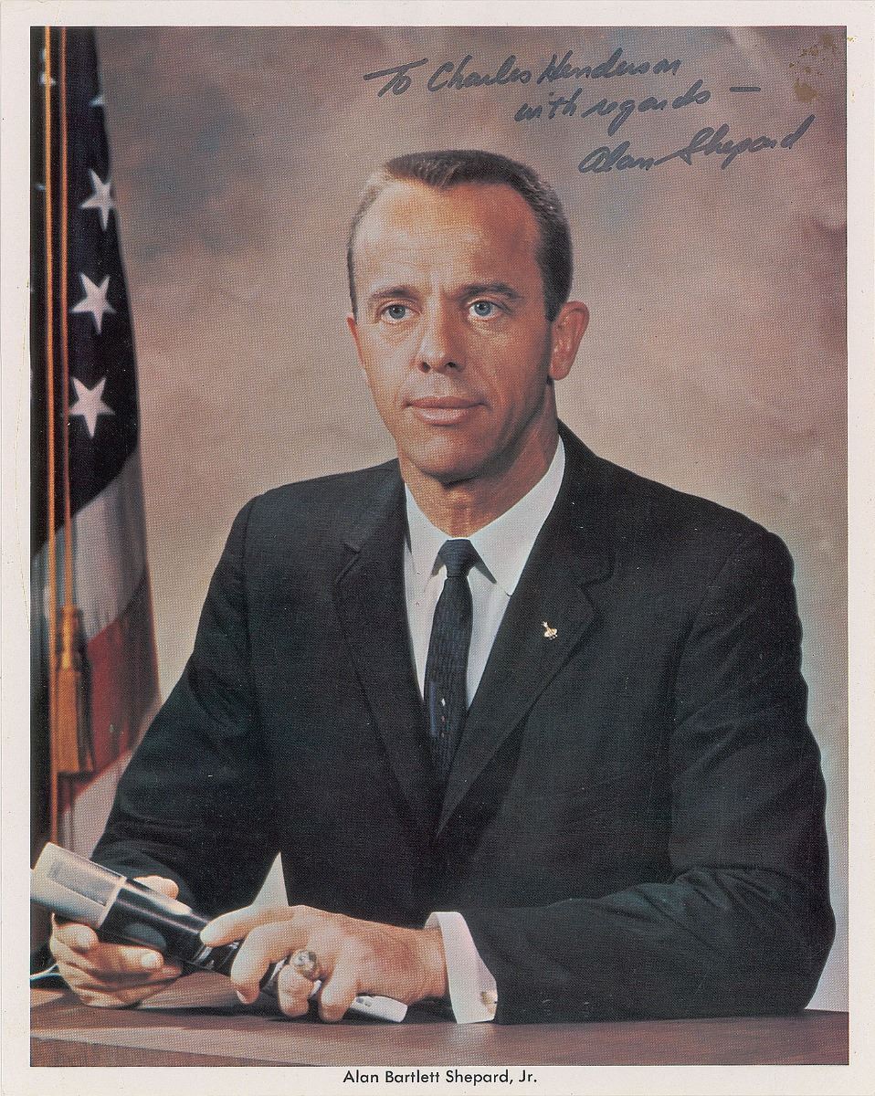 Official color 8 x 10 NASA lithograph of Shepard in a suit and tie, signed and inscribed in black felt tip, “To Charles Henderson, with regards—Alan Shepard.” In fine condition, with staining to the upper right corner.