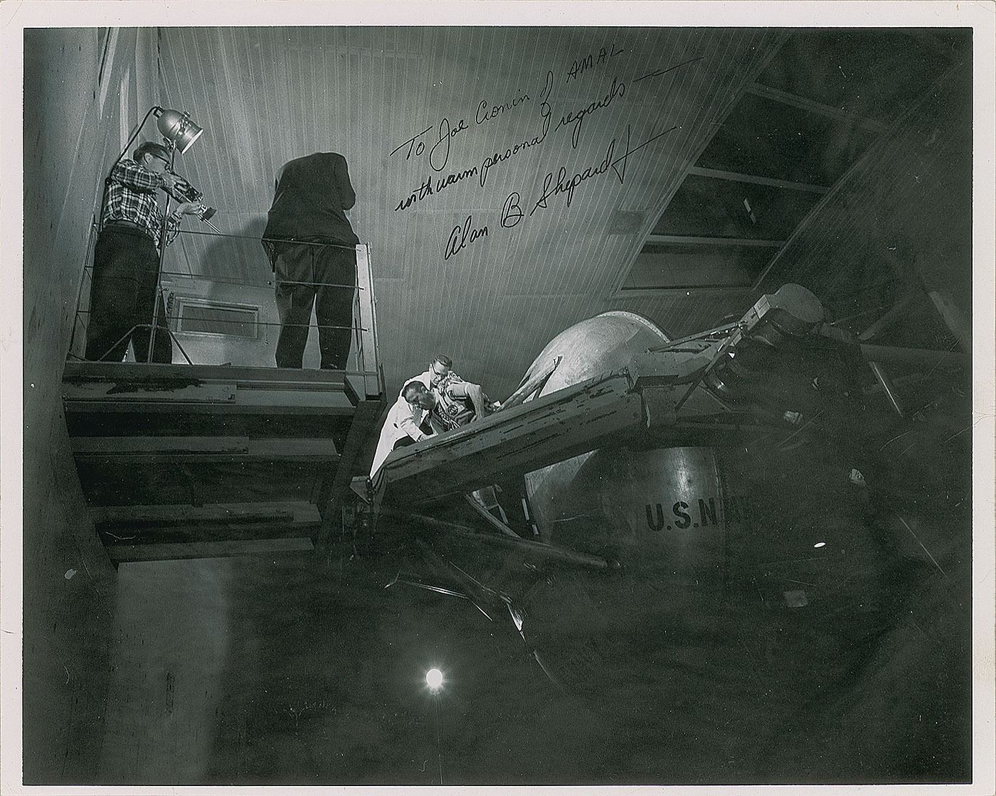 Vintage glossy 10 x 8 photo of Shepard being helped from the original 'Mercury 7 Gondola' of the Johnsville Centrifuge, signed and inscribed in black ink, "To Joe Cronin of AMAL, with warm personal regards—Alan B. Shepard.” Reverse bears an "Official Navy Photograph, Aeronautical Photographic Experimental Laboratory" stamp, dated May 5, 1961. In very good to fine condition, with scattered light creasing and surface impressions.