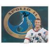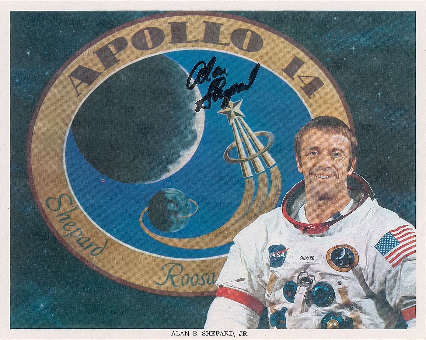 Desirable uninscribed official color 10 x 8 NASA lithograph of Shepard posing in his white space suit in front of the Apollo 14 mission insignia, signed in black felt tip. In fine condition.