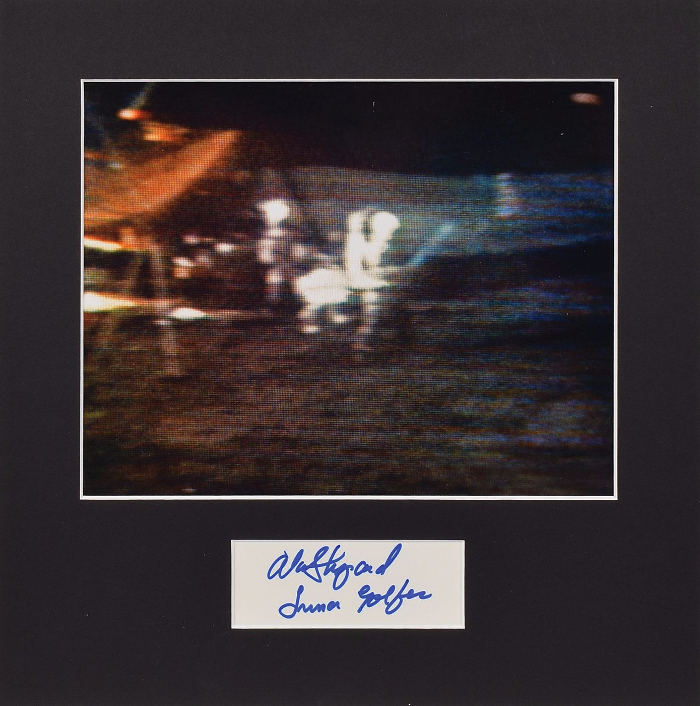 Uncommon felt tip signature, "Al Shepard, Lunar Golfer,” on a white 4 x 1.5 card. Matted with a photo of him golfing on the moon to an overall size of 12 x 12.5. In fine condition.