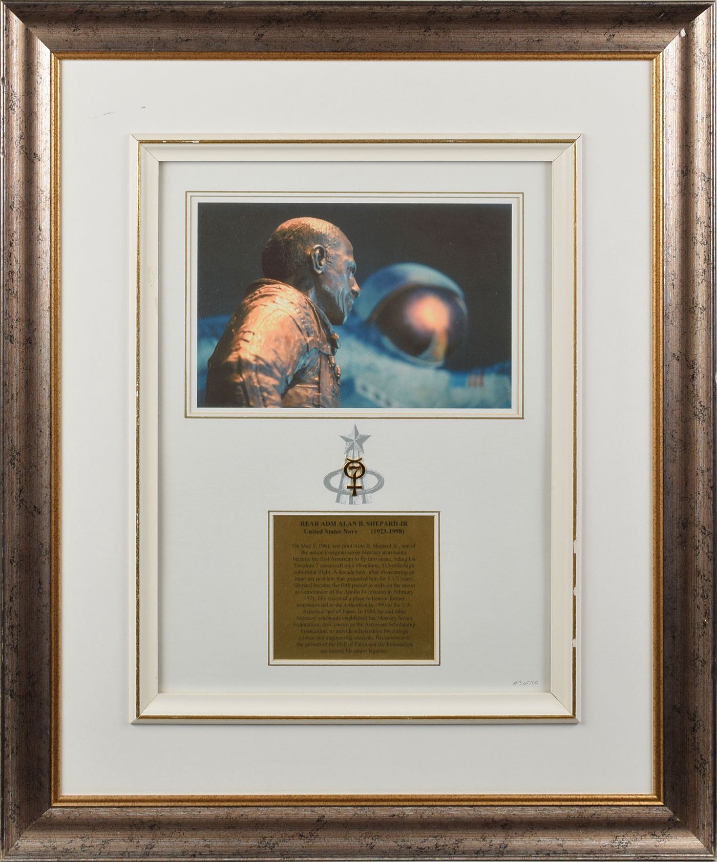 Limited edition display commemorating the career of astronaut Alan Shepard, numbered 3/100, featuring a golden Project Mercury lapel pin and a color 9.5 x 6.25 print of Shepard's statue at the United States Astronaut Hall of Fame in Titusville, Florida, both of which are handsomely matted and framed with a biographical caption to an overall size of 20.75 x 24.75. In fine condition.