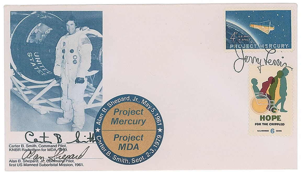 Limited edition cover 'carried' on board a backup Mercury capsule as it served as the broadcast vehicle for Carter B. Smith's 24-hour radiothon for MDA on KNBR radio on September 2–3, 1979, numbered 112/150, signed in black felt tip by Alan Shepard and Carter B. Smith. Also bears a stamped Jerry Lewis signature and a "Watch the Jerry Lewis Labor Day Telethon" postmark on the reverse. In fine condition.