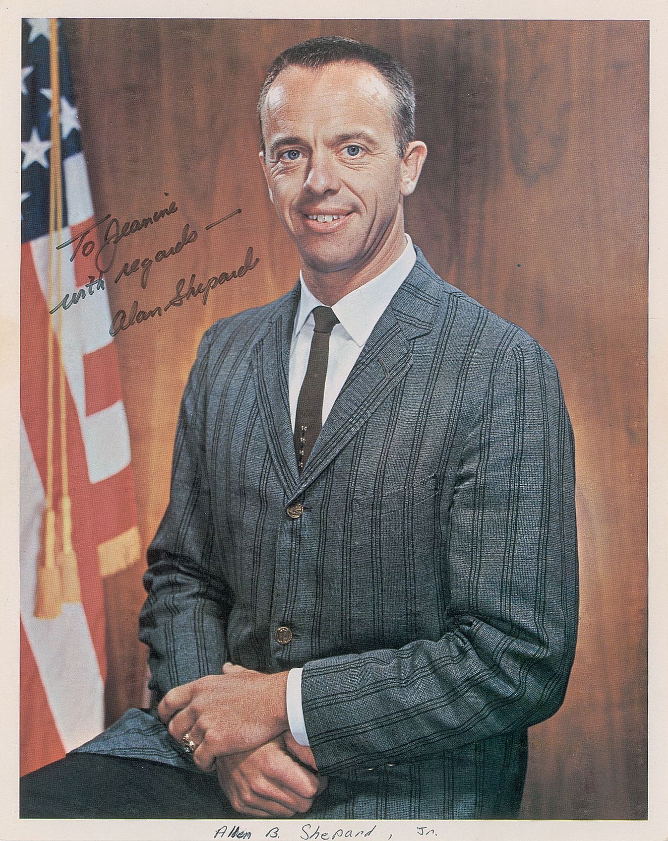 Uncommon official color 8 x 10 NASA lithograph of Shepard in a half-length seated pose, signed and inscribed in black felt tip, "To Jeanine, with regards—Alan Shepard.” In fine condition, with collector's notation to lower border. Recipient was an employee at the Los Angeles International Airport who assisted astronauts with picking up their GSA vehicles circa 1967.