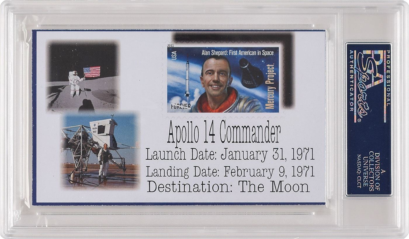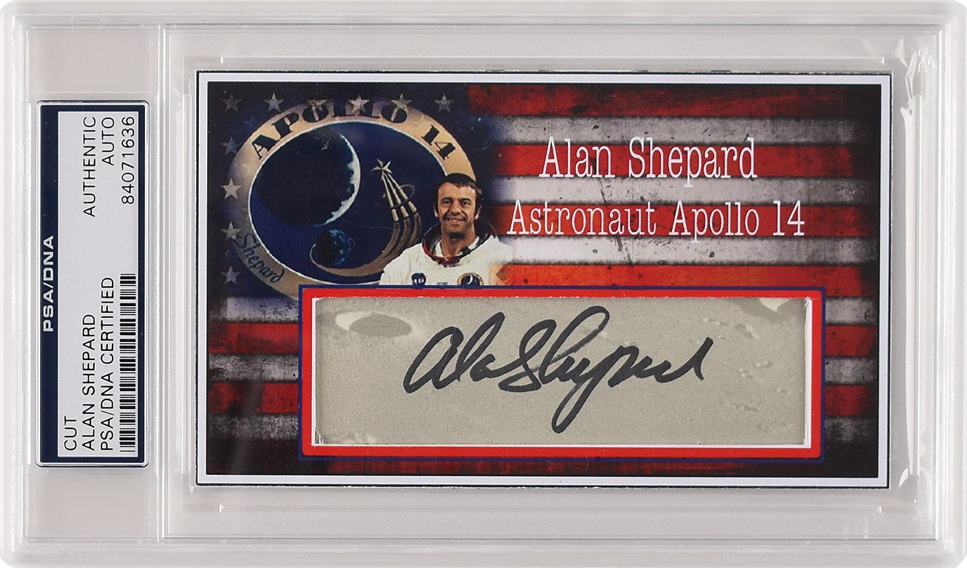 Felt tip signature, "Al Shepard,” on a gray 3.75 x 1 slip displayed within a custom-made 5 x 3 card. In very fine condition. Encapsulated in a PSA/DNA authentication holder.