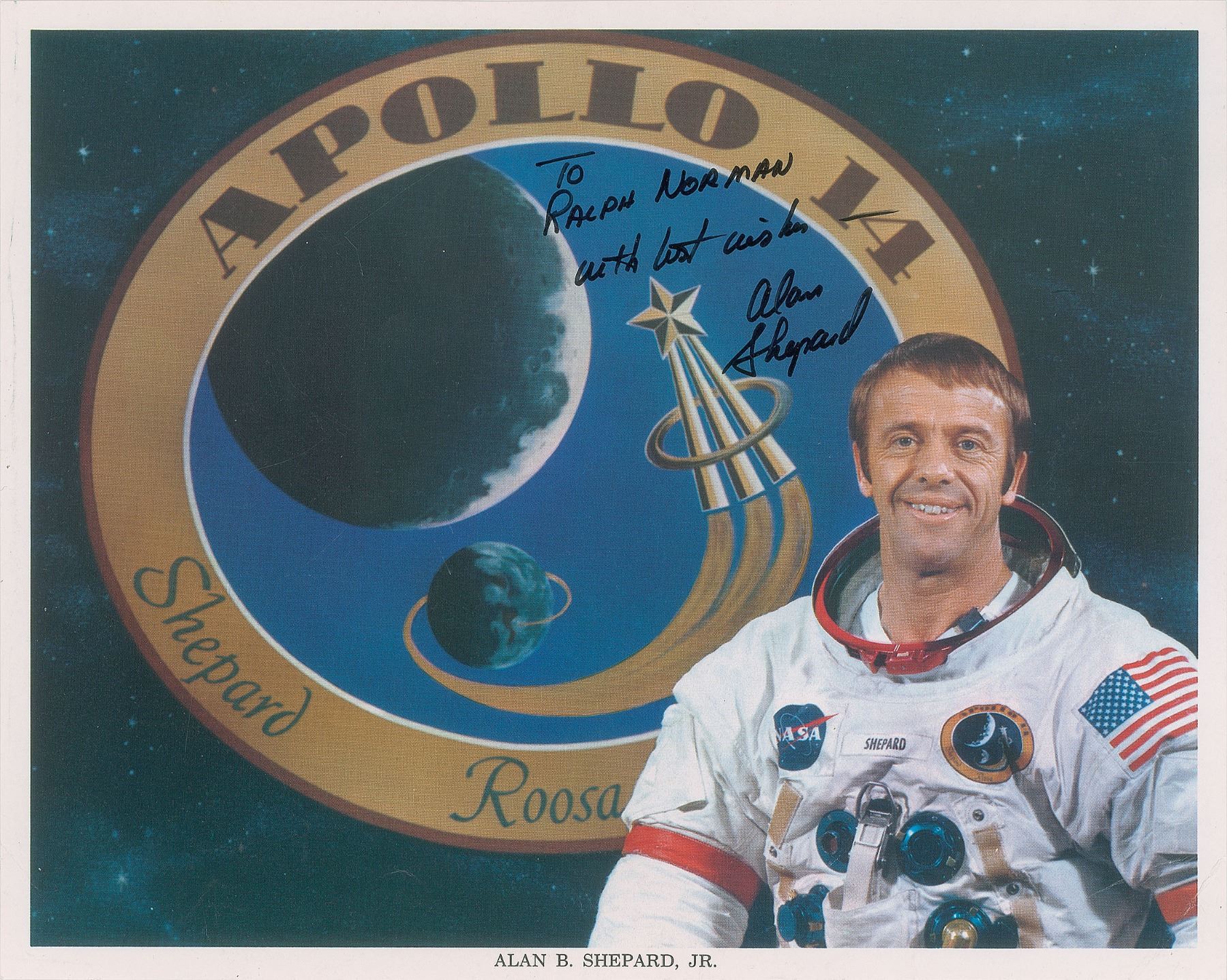 Official color 10 x 8 NASA lithograph of Shepard in his white space suit in front of the Apollo 14 insignia, signed and inscribed in black felt tip, "To Ralph Norman, with best wishes—Alan Shepard." In very good to fine condition, with scattered light creases.
