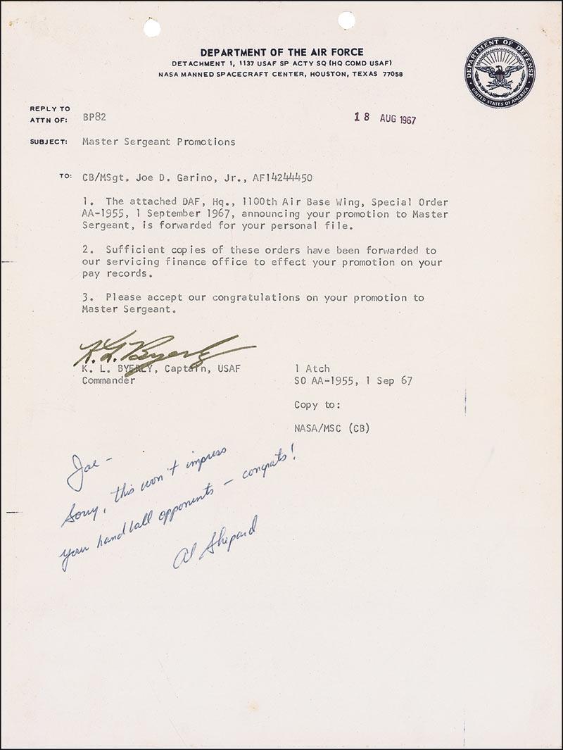 ANS signed “Al Shepard,” written at the bottom of a one page Air Force memo, 8.5 x 11, dated August 18, 1967. The memo is informing Joe Garino (the astronauts’ physical trainer at NASA) of his promotion to the rank of Master Sergeant. At the bottom, Shepard writes, “Joe—Sorry, this won’t impress your handball opponents—congrats!” Accompanied by a photocopied certificate of authenticity from Garino, stating the note came from his collection. In fine condition, with punch and staple holes at top edge. Pre-certified Scott Cornish and RRAuction COA.