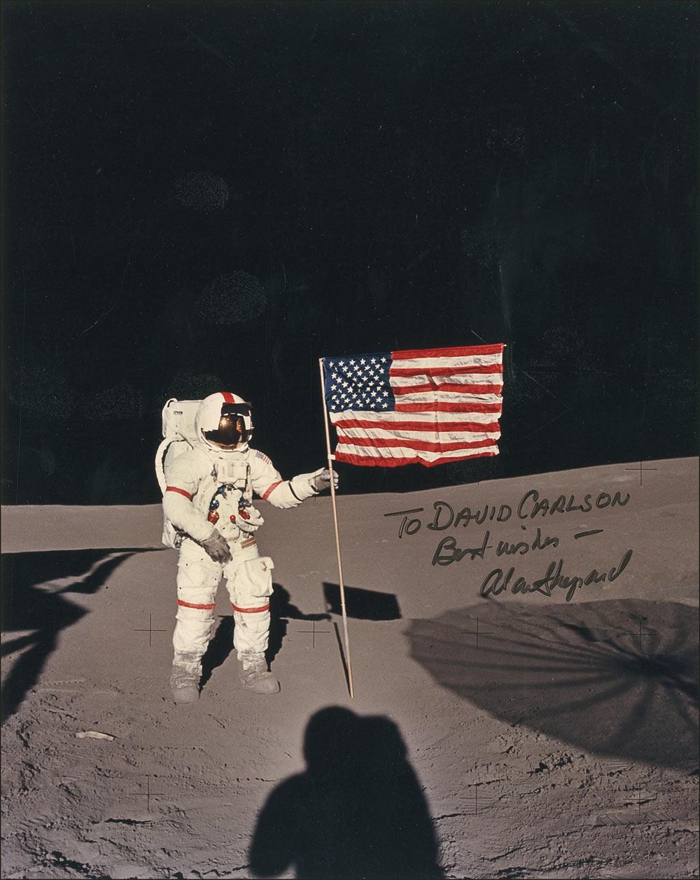 Uncommon color satin-finish 8 x 10 photo of Shepard posing with the American flag on the surface of the moon, signed and inscribed in black felt tip “To David Carlson, Best wishes–Alan Shepard.” In very good condition, with a few light surface creases, and scattered light spotting, primarily to background. Pre-certified Scott Cornish and RRAuction COA.