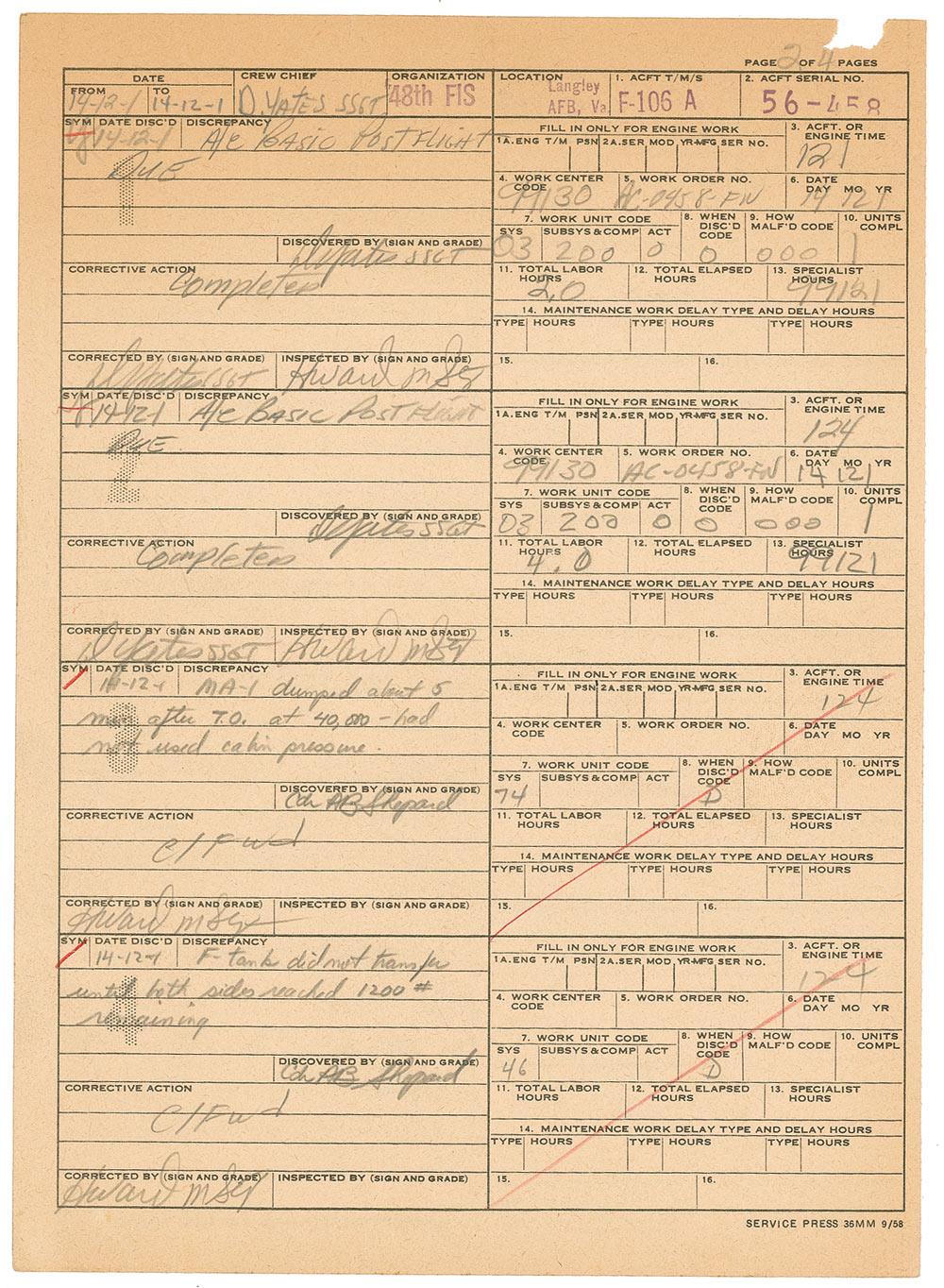 DS, signed “Cdr. A. B. Shepard,” one page both sides, 8 x 11, no date. Final page of an aircraft discrepancy and work record from Langley Air Force Base, for an F-106A, with two of the left side panels filled out in pencil and both signed by Shepard, who writes in one discrepancy, “F-tank did not transfer until both sides reached 1200# remaining.” Uniform shade of toning (heavier at edges), missing piece of paper at the top edge, and the remaining boxes filled out by enlisted personnel, otherwise in fine condition. An unusual format with direct flight-related content from one of the original Mercury 7 astronauts!