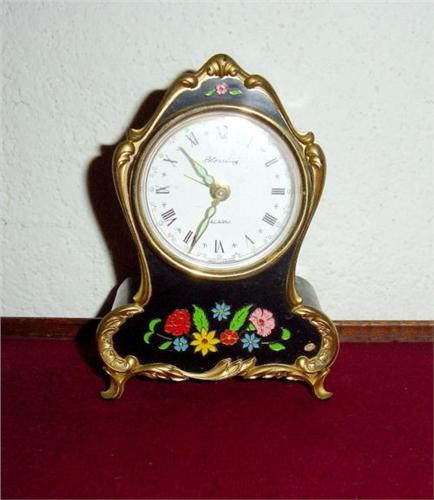 Réveil en forme de pendulette, motif à fleurs, signé sur le cadran BLESSING