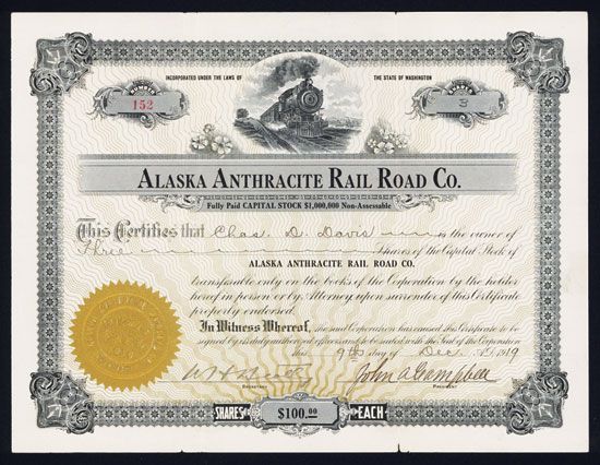 Washington, 1919, 3 Shares, Issued and Uncancelled Stock, #152, Black on black border and underprint, Moving locomotive with city far off in background on right and gold seal bottom left, VF-XF condition. Rare Alaska railroad bond. Listed railroad in Cox unlisted stock.