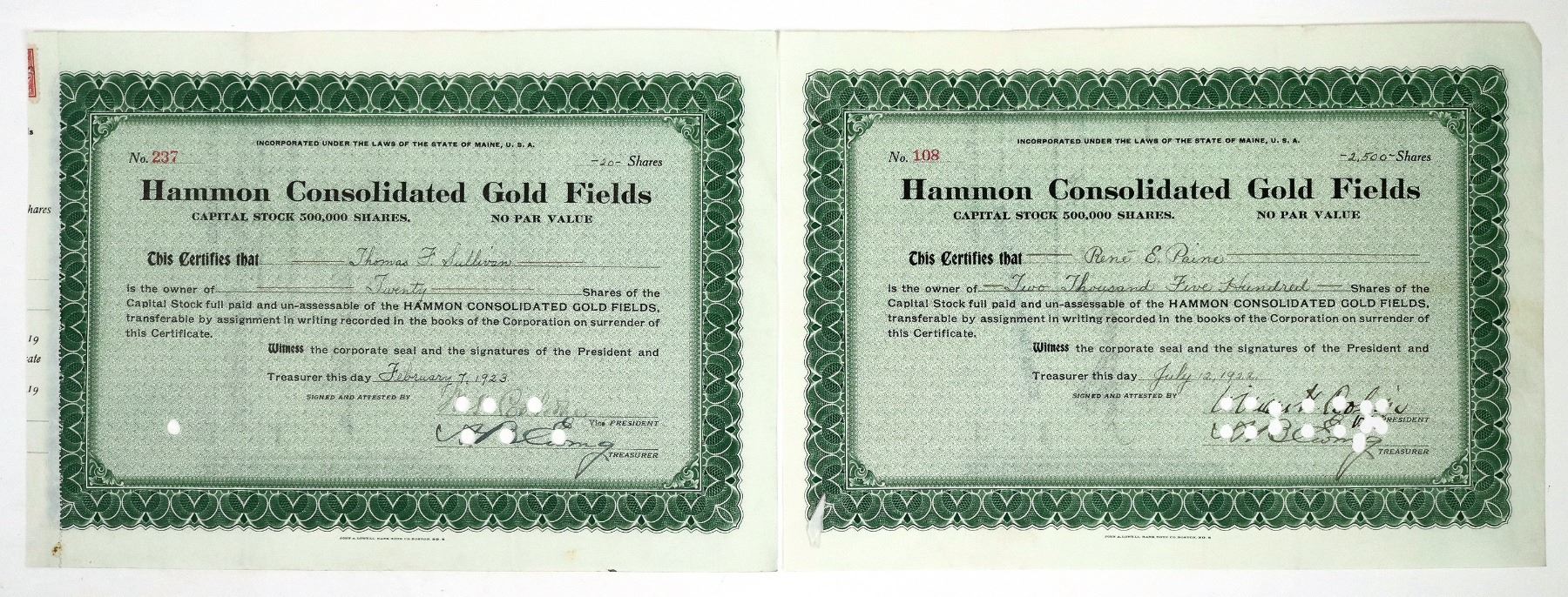 Two stock certificates for shares in the Hammon Consolidated Gold Fields, dated 1922 and 1923. The certificates are each signed by the president and treasurer of the company but have been cancelled with holes punched through the signatures. Hammon Consolidated began activity in Nome, Alaska in 1923; its assets were soon acquired by United States Smelting and Refining Company in 1924, though the Hammon Consolidated name was used until 1936. Both certificates are in good condition.