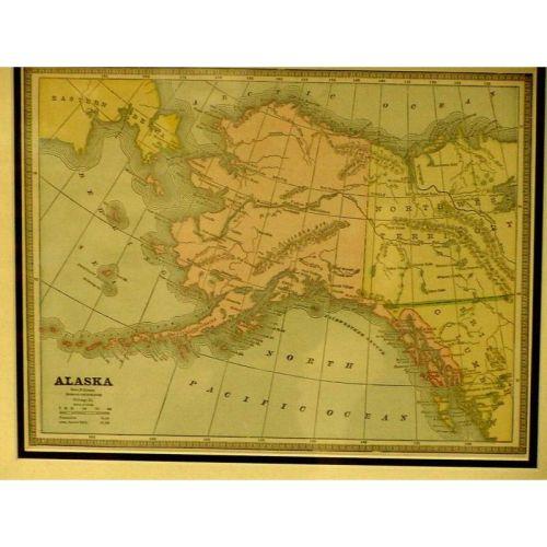 Authentic George Cram 1890 Map of Alaska, archivally framed, site size 12 1/2" wide by 9 1/2" tall. Excellent condition.