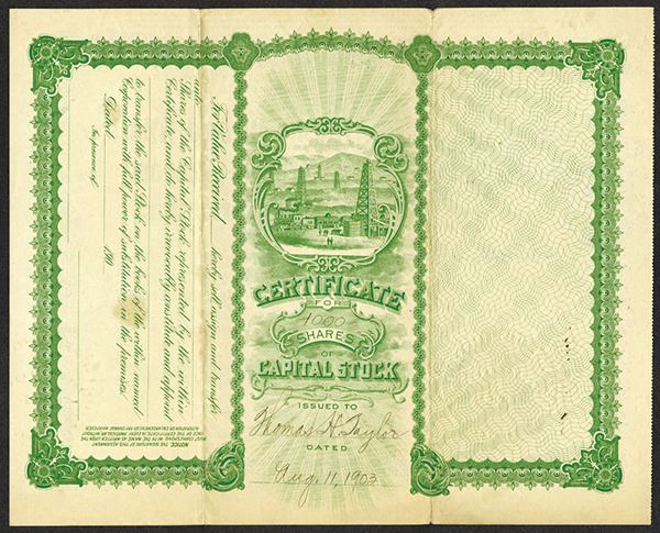 Arizona. 1000 Shares Preferred, Issued and Uncancelled Series A stock. Black border with gold undertint. Vignette of oil well at top left corner. XF.
