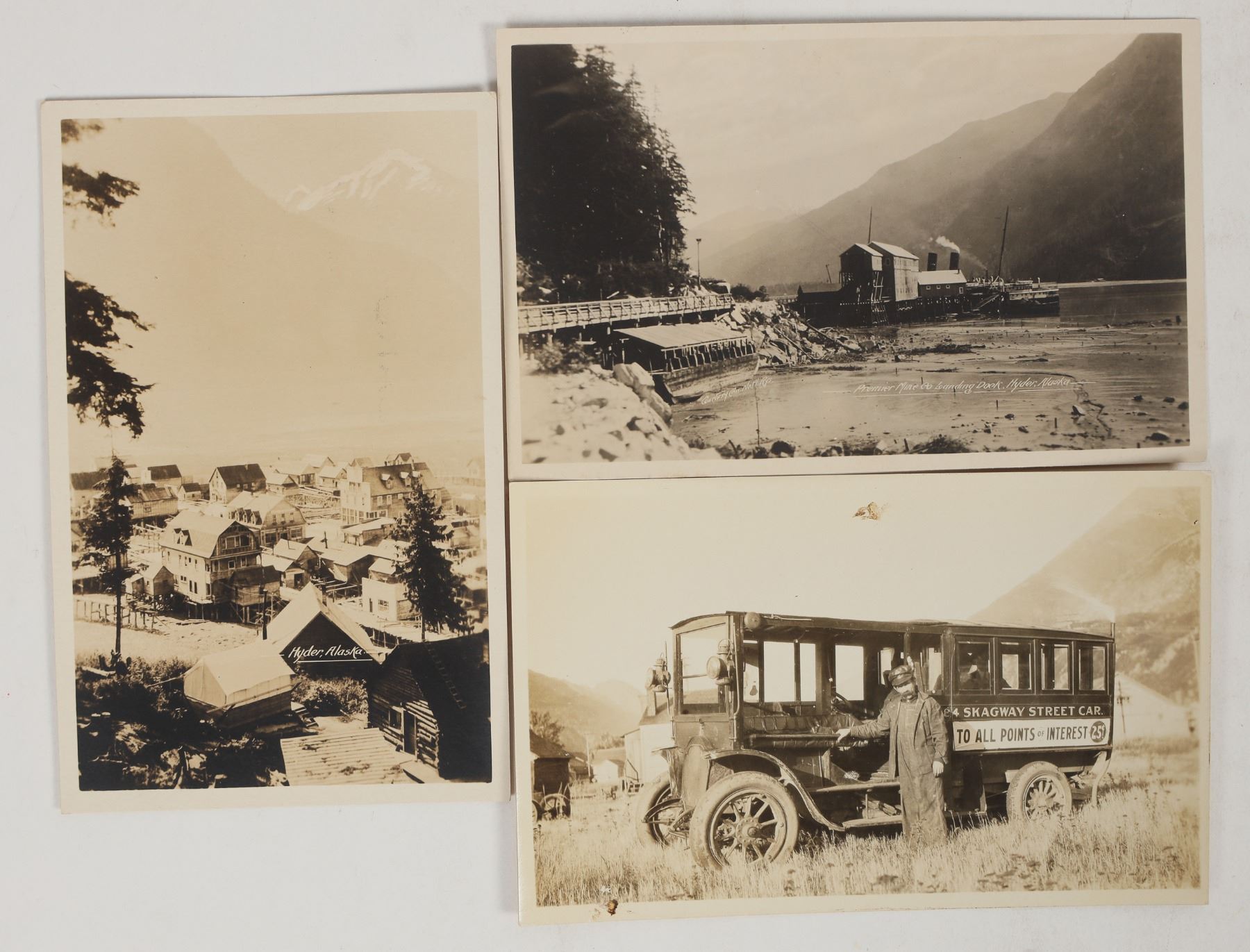Lot of 3. Two postcards of Hyder, Alaska: of the town Birdseye and of Premier Mine loading dock. One of Skagway tour bus. VG cond. No writing.