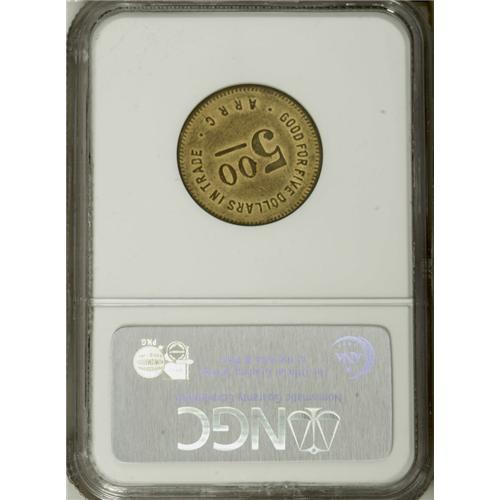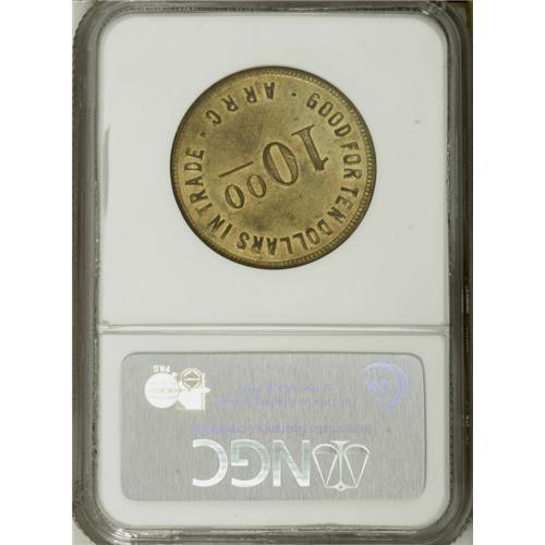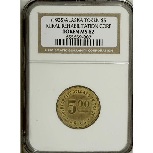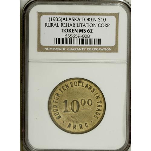 <B>Alaska Rural Rehabilitation Corporation Two Piece Set, MS62 NGC.</B></I> Included are two of the high denominations from the eight piece set, the ten dollar and five dollar tokens. These are listed in the current 2007 edition of the <I>Guide Book</B></I> on page 385. These tokens were called "bingles" and were issued by the U.S. government to supply workers at the Matanuska Valley Colonization Project. The tokens were withdrawn after a period of six months and exchanged for current money, then destroyed. The <I>Guide Book</B></I> values the tokens in MS60 at $675 for the pair.<BR><BR><b>Shipping:</b> Coin/Currency (<a target="_blank" href="http://www.heritageauctions.com/common/shipping.php">view shipping information</a>)