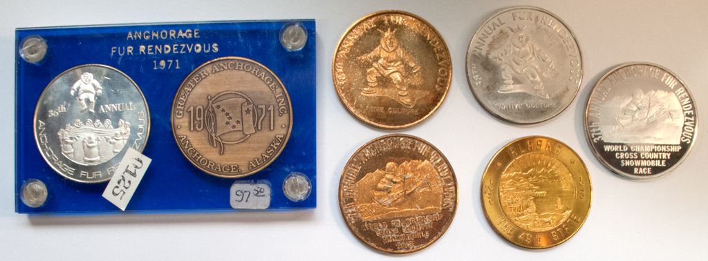 2 each from 1971, 1972, and 1974 Anchorage Fur Rendezvous. 1 piece from Fairbanks Birthday celebration.7 pieces