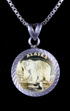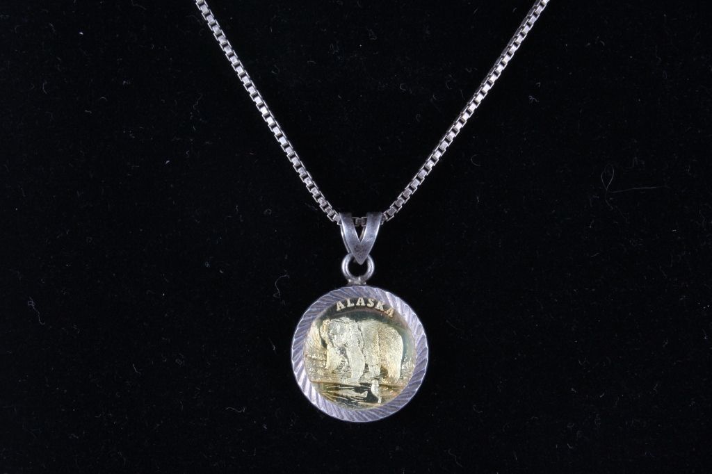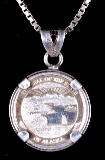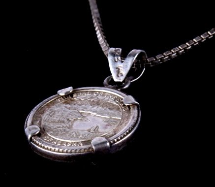 This lot features a unique Alaska coin necklace. The coin itself is nicely toned and enclosed in the sterling silver necklace. The pendant measures .7" and the chain is 17".